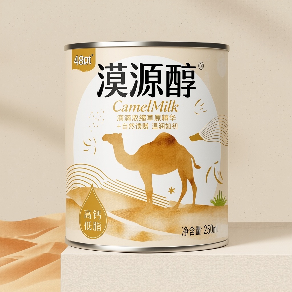 产品:驼奶;品牌名:漠源醇;包装样式:圆形马口铁罐装,哑光质感金属材质;包装营销卖点:源自沙漠黄金牧场的天然滋养,以骆驼剪影与沙丘线条为核心视觉符号;包装主视觉面排版:上下排版,主标题“漠源醇”粗黑体48pt居上,副标题“CamelMilk”细衬线体12pt,二级文字“滴滴浓缩草原精华”+“自然馈赠 温润如初”各8pt,净含量“250ml”置于右下角6pt,背景层为浅米色磨砂肌理,主图案采用写实水彩风单峰骆驼侧影立于沙丘之上,辅以飘逸流沙线条与星点绿洲植物装饰,左下角嵌入金色乳滴图标内标“高钙低脂”,整体视觉重心落于骆驼图案,文字区通过半透明白色衬底强化可读性;设计风格:自然有机感融合现代极简美学;主题配色:主色沙漠金,辅色乳白。