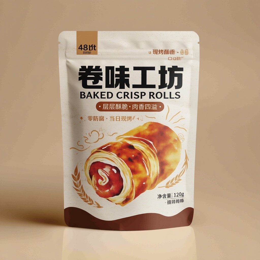 产品:酥皮烤肠卷;品牌名:卷味工坊;包装样式:食品自立袋,哑光镀铝膜材质触感细腻防油污;包装营销卖点:以“现烤酥香·一口爆汁”为核心,突出手工现烤工艺与黄金酥皮层次;包装主视觉面排版:上下排版,主标题“卷味工坊”黑体粗字48pt居顶,副标题“BAKED CRISP ROLLS”衬线体12pt,二级文字“层层酥脆·肉香四溢”+“零防腐·当日现烤”各8pt置于中部,净含量“120g”于右下角;背景层为浅米色肌理纸纹,主图案采用水彩天然风绘制酥皮剖面焦糖色层叠纹理,装饰图案含飘散热气线条与麦穗轮廓烫金小图标,底部缀有深棕波浪装饰带强化食欲感;设计风格:现代极简融合手绘质感;主题配色:焦糖棕+奶油白。