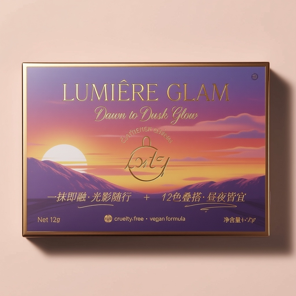 产品:眼影盘;品牌名:LUMIÈRE GLAM;包装样式:长方形精品礼盒,选用珠光压纹艺术纸,触感柔滑带高级光泽;包装营销卖点:以“色彩灵感源自晨曦与暮色”为核心概念,将日出日落的渐变天色转化为12款可叠搭眼影色调;包装主视觉面排版:满版排版,主标题“LUMIÈRE GLAM”使用粗衬线体36pt居中于顶部,副标题“Dawn to Dusk Glow”无衬线体9pt置于其下;二级文字为“一抹即融·光影随行”+“12色叠搭·昼夜皆宜”,字号7pt纤细手写体分列左右;三级文字含净含量“Net 12g”及小图标“ cruelty-free · vegan formula”;设计元素背景层为晕染式水彩天然风渐变紫橙粉,主图案为抽象飞鸟掠过天际线插画风格,装饰图案含微缩云朵与星点烫金箔,小图标为羽毛与调色盘简约线描;设计风格:轻奢梦幻插画风;主题配色:主色暮霭紫、辅色晨曦金。