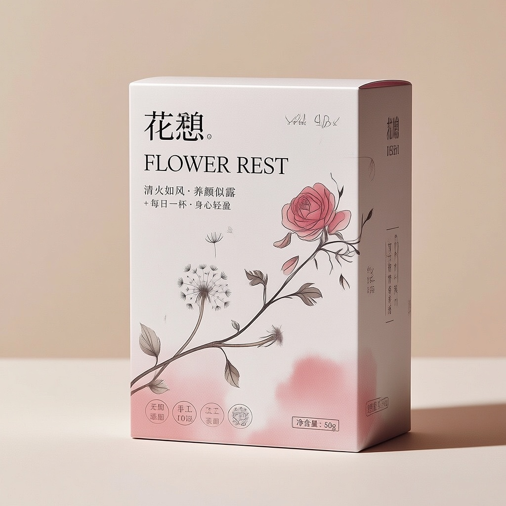 产品:蒲公英玫瑰茶;品牌名:花憩;包装样式:长方体纸质礼盒,选用哑光白卡纸材质,触感细腻温润;包装营销卖点:以“自然疗愈双花协奏”为核心概念,突出蒲公英清火与玫瑰养颜的天然协同功效;包装主视觉面排版:采用上下排版,主标题“花憩”黑体加粗48pt居上,副标题“FLOWER REST”无衬线24pt轻盈衬底,下方配二级宣传语“清火如风·养颜似露”+“每日一杯·身心轻盈”均为思源宋体10pt,净含量“50g”置于右下角图标内;设计元素图案背景层为极简米白渐变,主图案为工笔风手绘蒲公英与玫瑰交缠枝蔓,线条纤柔写实,装饰图案为底部若隐若现的水彩晕染花瓣纹理,小图标含“无添加”“手工采摘”双认证标章;设计风格:现代东方极简主义,融合自然疗愈美学;主题配色:主色浅雾粉,辅色灰陶白。