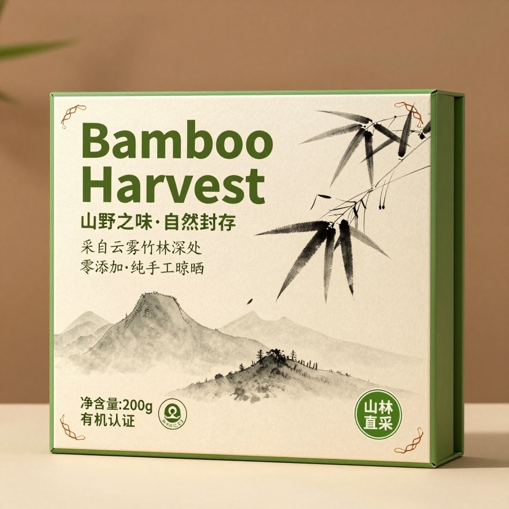 产品:笋干;品牌名:Bamboo Harvest;包装样式:长方形精品礼盒,采用哑光环保牛皮纸材质,触感温润粗粝;包装营销卖点:源自深山竹林的自然馈赠,每一口都是山野本味;包装主视觉面排版:上下排版,主标题“Bamboo Harvest”使用无衬线粗体字28pt居上,副标题“山野之味·自然封存”16pt细宋体置于其下;二级文字为宣传语1“采自云雾竹林深处”与宣传语2“零添加·纯手工晾晒”各7pt手写体;三级文字含净含量“200g”及“有机认证”小图标内文案。背景层为米色肌理纸纹,主图案是工笔风层叠山脉轮廓衬于中下部,上方飘落三片写意水墨竹叶,边缘饰以棕色细线勾边藤蔓纹,右下角嵌入绿色圆形小图标标注“山林直采”。设计风格:简约自然风;主题配色:主色竹青绿、辅色暖棕褐。
