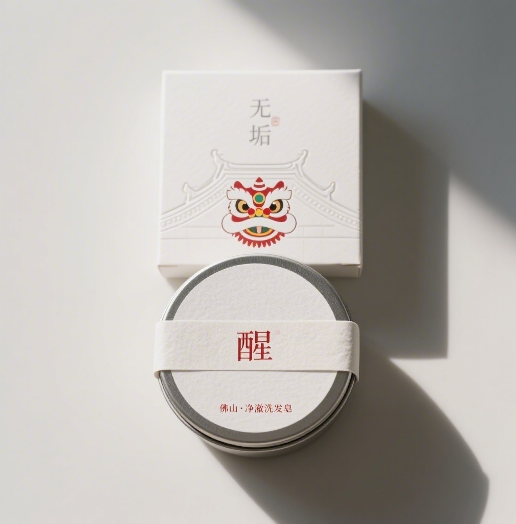产品:佛山净澈洗发皂;品牌名:无垢;包装样式:圆形马口铁罐+哑光仿棉纸不干胶贴+窄幅腰封+方形天地盒,哑光白卡外盒触感温润挺括;包装营销卖点:以“醒狮点睛”文化符号唤醒头皮活力,隐喻产品净澈提神功效;包装主视觉面排版:上下排版,上半部纯留白仅顶部极小灰字印“无垢”,下半部30%面积独字“醒”采用宋代细宋体,底部右对齐小字“佛山·净澈洗发皂”,背景满版击凸佛山镬耳山墙轮廓线;设计风格:东方极简禅意风,融合宋代刻本字体与岭南建筑肌理,印章元素强化地域精神图腾;主题配色:月白主色+朱砂红辅色。