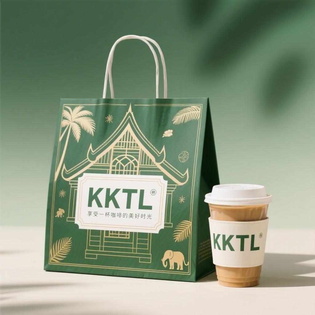 产品:泰式奶茶;品牌名:KKTL / 宣传语“享受一杯咖啡的美好时光”;包装样式:手提袋+杯套组合装,采用哑光特种纸模拟绿染布质感,触感温润;包装营销卖点:以南洋建筑与热带元素唤醒异域饮茶仪式感;包装主视觉面排版:覆盖式排版,背景层为橄榄绿渐变晕染底纹,主图案为抽象化南洋耳屋轮廓与窗棂纹样,采用工笔风勾勒,装饰图案含棕榈叶与大象剪影小图标散落四周,亮金细线框环绕四边,主标题“KKTL”居中置于白色描边矩形衬底上,字体粗黑体48pt,副标“享受一杯咖啡的美好时光”分两行纤细宋体10pt置于其下;设计风格:新中式文化风融合极简留白,传统符号现代化演绎;主题配色:橄榄绿主色 + 米白辅色。