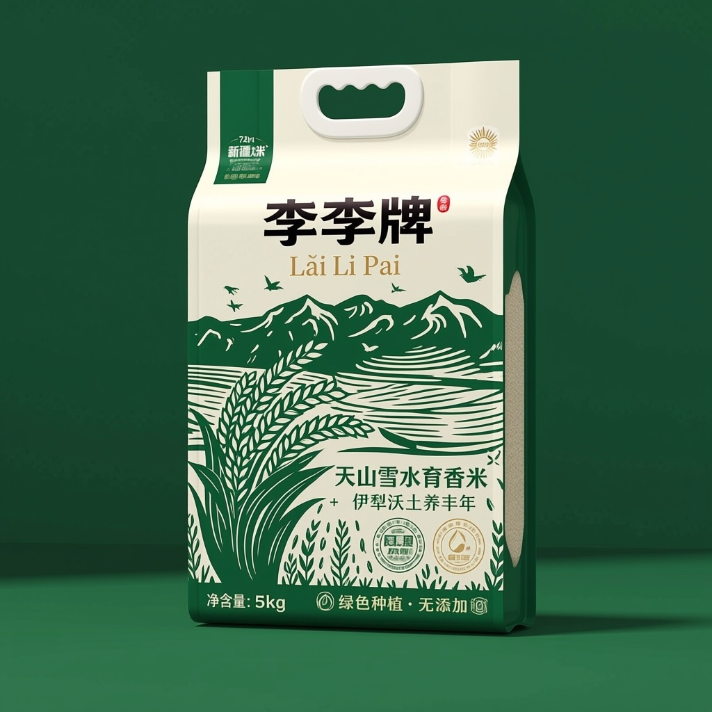 产品:新疆大米;品牌名:李李牌;包装样式:食品自立袋,采用哑光环保牛皮纸材质,触感自然粗朴;包装营销卖点:源自天山雪水灌溉的纯净稻田,每一粒米都饱含西域阳光与风土馈赠;包装主视觉面排版:上下排版,主标题“李李牌”黑体粗字72pt居上,副标题“Lǐ Lǐ Pái”衬线体24pt,下方配二级宣传语“天山雪水育香米”+“伊犁沃土养丰年”,三级文字“净含量:5kg”及“绿色种植·无添加”图标;设计元素图案以深绿与留白构成版画肌理背景层,主图案为工笔勾线风格的大米植株与层叠稻田,远景融入伊犁天山脉轮廓,装饰图案含飞鸟剪影与麦穗纹样,小图标为水滴形认证标与地理标识徽章;设计风格:传统木刻版画风格融合现代极简构图;主题配色:森林绿为主,象牙白为辅。