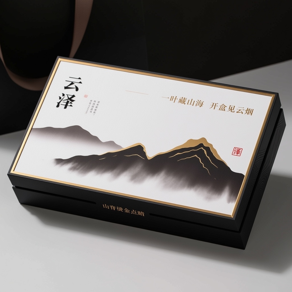 产品:高端商务茶叶礼盒;品牌名:“云泽”竖排墨黑重磅宋体;包装样式:长方形精品礼盒,300g特种哑光艺术纸,触感温润无反光;包装营销卖点:以“山脊烫金点睛”为视觉焦点,克制工艺呼应东方留白哲学,强化开盒仪式感与收藏价值;包装主视觉面排版:上下构图,左上“云泽”竖排居左,右上横排“一叶藏山海 开盒见云烟”细宋体,右下朱砂“泽”印,背景层纯宣纸白肌理,主图案水墨晕染远山占下半部,仅山脊线局部烫哑窑金,极细金框围合盖面,左侧淡墨远山小字装饰,盒体深墨黑侧压回纹肌理;设计风格:新东方极简禅意,现代材质承载传统意境;主题配色:深墨黑×窑金。