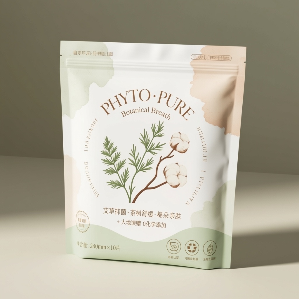 产品:天然有机卫生巾;品牌名:PHYTO·PURE;包装样式:再生牛皮纸复合膜自立袋,微糙肌理透出自然环保质感;包装营销卖点:以“植萃呼吸感”为核心,融合艾草、茶树、棉朵三大天然成分视觉符号,传递无香精无荧光剂的纯净护理承诺;包装主视觉面排版:环绕式排版,中央主标题“PHYTO·PURE”采用手写衬线体30pt浅棕字,副标题“Botanical Breath”10pt米白细体轻绕其下;二级文字为“艾草抑菌·茶树舒缓·棉朵亲肤”+“大地馈赠 0化学添加”均8pt手绘风格小字沿边分布;净含量“240mm×10片”左下角6pt;设计元素图案背景层为米白水彩晕染,主图案为三株交错生长植物——艾草叶脉清晰、茶树枝条蜿蜒、棉朵蓬松绽放,均采用淡彩手绘线条风,装饰图案含底部波浪形浅绿生态带,小图标为“有机认证”“可堆肥包装”“无荧光检测”三枚叶形徽章;设计风格:自然疗愈极简风;主题配色:主色柔雾浅绿、辅色原生浅棕。