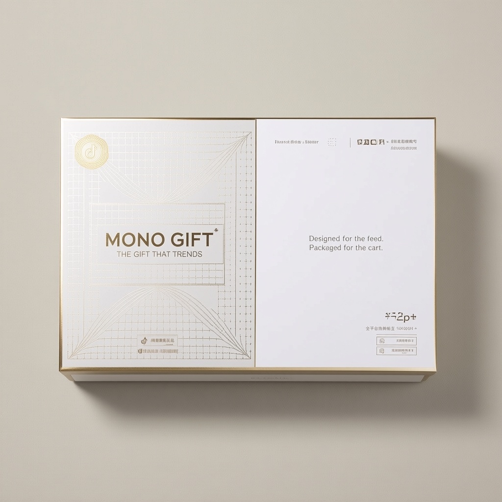 产品:奢感爆款伴手礼盒;品牌名:MONO GIFT;包装样式:长方形精品礼盒,400g进口棉柔纸覆哑光膜,触感如高级皮具般细腻沉稳;包装营销卖点:“无声的奢侈,爆单的底气”,主视觉以无衬线超大品牌字+极简负空间构建国际大牌视觉语言;包装主视觉面排版:左右排版,左侧一级文字“MONO GIFT”超粗无衬线72pt+英文副标“THE GIFT THAT TRENDS”14pt垂直对齐,右侧留白区仅置二级文字“Designed for the feed.”+“Packaged for the cart.”9pt右下角微缩排布,三级无净含量,“全平台热销标王”“开箱即晒款”烫哑金徽章嵌于左上角;背景层为纯暖灰微织纹底,主图案为空白负空间中一道垂直烫铂金细线贯穿画面,装饰图案含隐形网格与毫米级金边描框,小图标含“抖音爆款认证”“小红书晒图TOP1”极简金属标;设计风格:极简主义、图文呼吸感、奢侈品电商基因;主题配色:冷调铂金银+暖灰象牙白。