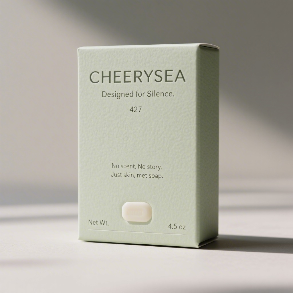 产品:香皂;品牌名:CHEERYSEA;包装样式:长方形精品礼盒,选用柔灰哑光特种纸,触感如丝绒般细腻沉静;包装营销卖点:以“纯粹触感哲学”为概念,剥离品牌语义干扰,聚焦材质、留白与比例构建高级简约美学;包装主视觉面排版:采用以文字为主式排版,背景层为极微纹理暖灰底,无图案装饰,仅于中央垂直排列品牌名“CHEERYSEA”(现代无衬线超粗体42pt),副标题“Designed for Silence.”(极细等宽体7pt)紧贴其下,二级文字宣传语1“No scent. No story.”+宣传语2“Just skin, met soap.”(5.5pt纤细无衬线)分列左下与右下角形成视觉锚点,三级文字“Net Wt. 4.5 oz”与极简皂形图标嵌于底部1mm浅凹线内;设计风格:极简主义融合德式理性排版美学;主题配色:主色暖石灰、辅色冷雾白。