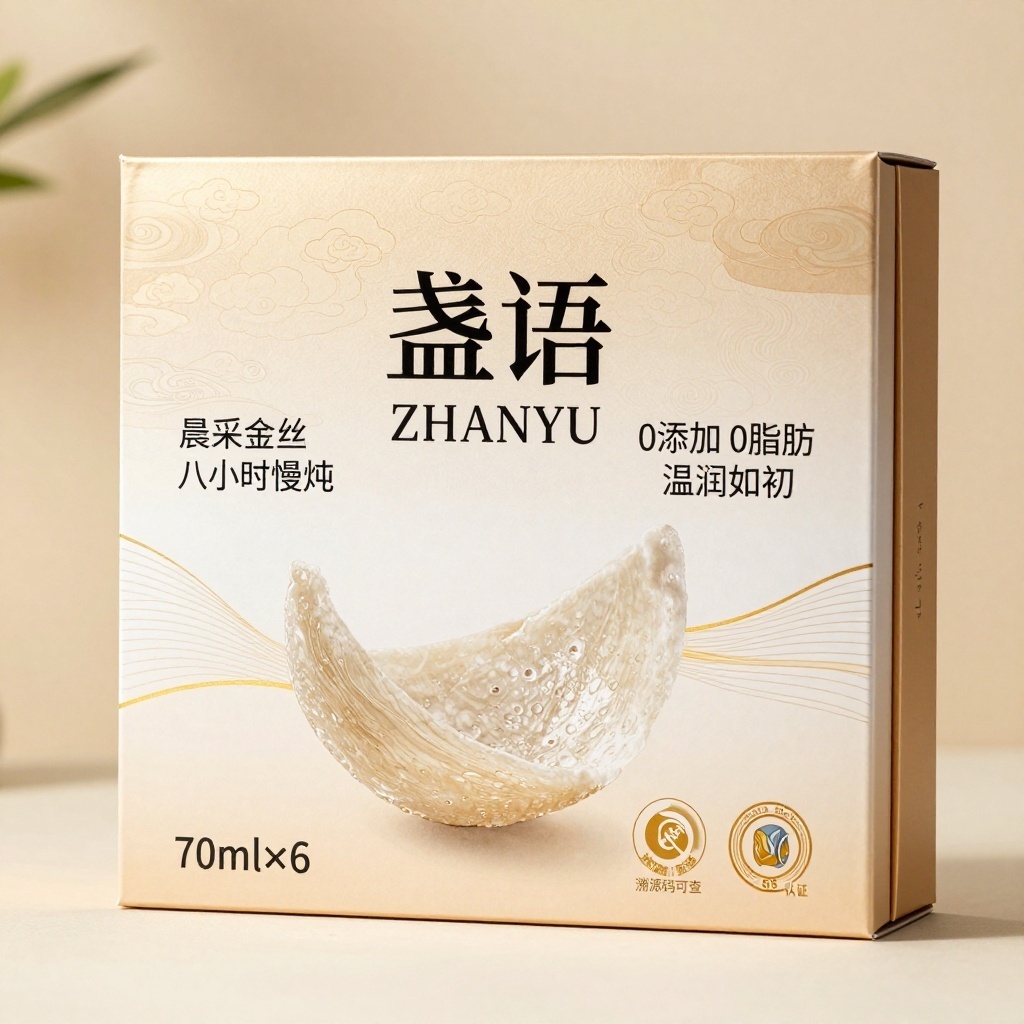 产品:高端即食燕窝;品牌名:盏语;包装样式:长方形纸套盒,选用柔韧涂布白卡纸,表面微磨砂质感;包装营销卖点:以“一盏凝时”为概念,强调燕窝凝萃时光精华的珍贵属性;包装主视觉面排版:覆盖式排版,主标题“盏语”黑体粗字36pt居中压印于图案之上,副标题“ZHANYU”无衬线体8pt紧贴其下,二级文字宣传语1“晨采金丝 八小时慢炖”与宣传语2“0添加 0脂肪 温润如初”均为细宋体9pt分置标题两侧,净含量“70ml×6”标注于左下角;背景层为浅米色渐变云纹肌理,主图案采用水彩天然风绘制燕盏悬浮于光晕中,装饰图案含抽象波纹与金丝线条,小图标为烫金“溯源码可查”与“SGS认证”标识;设计风格:轻奢极简融合东方滋养美学;主题配色:主色琥珀金、辅色月牙白。