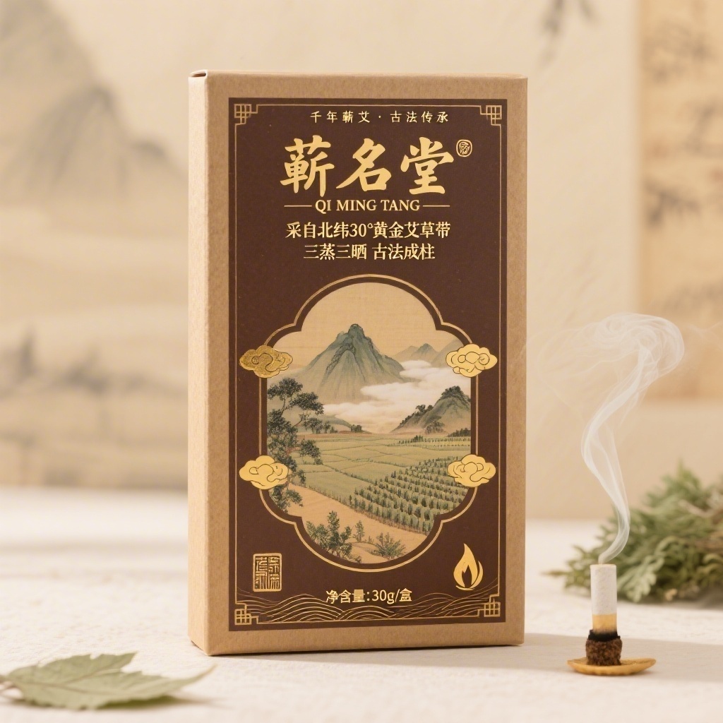产品:蕲艾柱;品牌名:蕲名堂;包装样式:长方体硬质纸盒,选用哑光纹理特种纸,触感温润古朴;包装营销卖点:以“千年蕲艾·古法传承”为核心,突出道地产区与手工制作工艺;包装主视觉面排版:上下排版,主标题“蕲名堂”为手写书法体金色大字60pt居上,副标题“QI MING TANG”衬线体12pt,二级文字“采自北纬30°黄金艾草带”+“三蒸三晒 古法成柱”各8pt分列下方,三级文字“净含量:30g/盒”及火焰灸疗小图标置于右下角;设计元素图案:背景层为米色宣纸肌理,中央山水工笔风主图案描绘大别山云雾缭绕艾田,两侧饰金色云纹边框,底部缀青烟袅袅线描纹,四角嵌艾叶篆刻小章;设计风格:新中式古风,融合文人画意境与传统药典美学;主题配色:深棕色为主、米色为辅,金箔提亮。