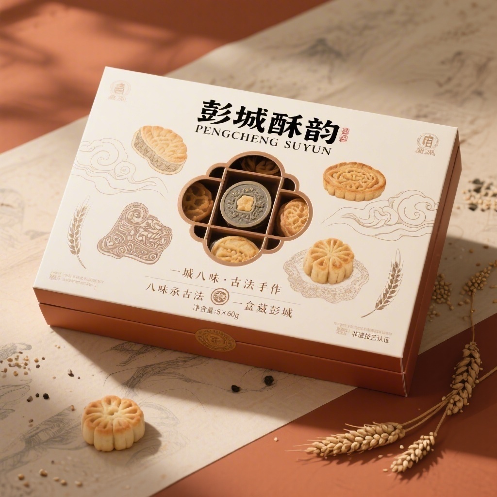 产品:徐州八大糕点系列;品牌名:彭城酥韵;包装样式:长方形精品礼盒,采用250g哑光艺术纸,触感温润细腻;包装营销卖点:以“一城八味·古法手作”为核心,融合徐州汉文化图腾与糕点原料元素,打造地域风味收藏级礼盒;包装主视觉面排版:上下排版,主标题“彭城酥韵”黑体粗字48pt居上,副标题“PENGCHENG SUYUN”衬线体12pt,下方左右分列宣传语1“八味承古法”与宣传语2“一盒藏彭城”,各10pt;背景层为浅米色宣纸肌理,主图案采用工笔风绘制八种糕点轮廓环绕汉代云纹,中央嵌铜钱形镂空窗格透出内盒糕点实物图,四角装饰麦穗与芝麻粒线描,底部缀有“净含量:8×60g”及“非遗技艺认证”圆形图标;设计风格:新中式雅致风,融合传统纹样与现代极简构图;主题配色:主色暖赭石+辅色青灰。