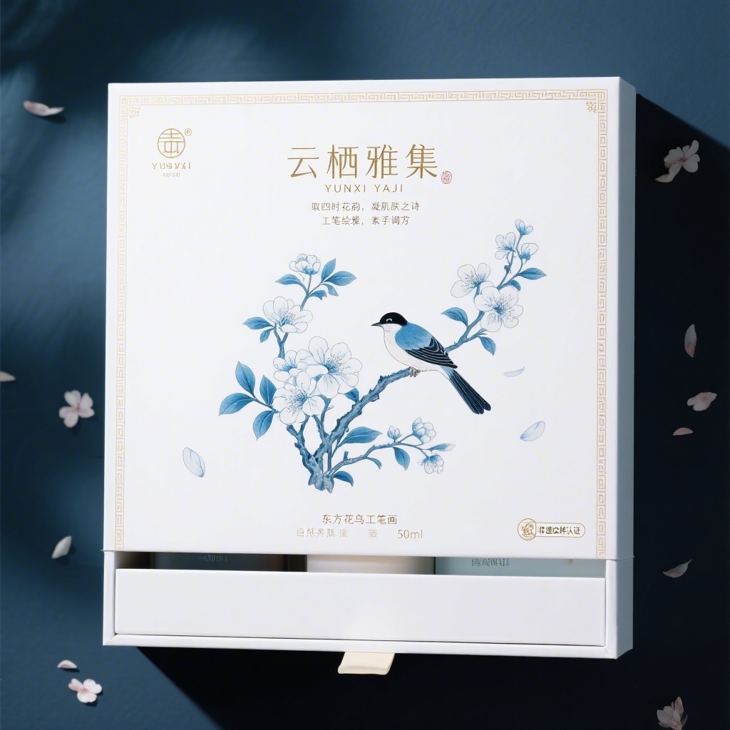 产品:国风古典花鸟纹样化妆品礼盒;品牌名:云栖雅集;包装样式:抽拉式精品礼盒,选用高克重哑光艺术纸,触感温润细腻;包装营销卖点:以“东方花鸟工笔画”为核心视觉元素,传递“自然养肤,诗意焕颜”的东方美学护肤理念;包装主视觉面排版:上下排版,主标题“云栖雅集”居上,衬线体48pt,副标题“YUNXI YAJI”无衬线体10pt,二级宣传语“取四时花韵,凝肌肤之诗”+“工笔绘雅,素手调芳”各8pt,三级文字含净含量“50ml”及“非遗纹样认证”图标;设计元素为留白背景层占70%,中央主图案为工笔风蓝白花鸟缠枝纹,枝蔓婉转如云,雀羽纤毫毕现,四周点缀极细金线回纹边框与散落花瓣,左上角嵌品牌LOGO徽章小图标;设计风格:新中式工笔雅致风,融合宋代院体画意蕴与现代极简留白;主题配色:主色月光白,辅色天青釉蓝。