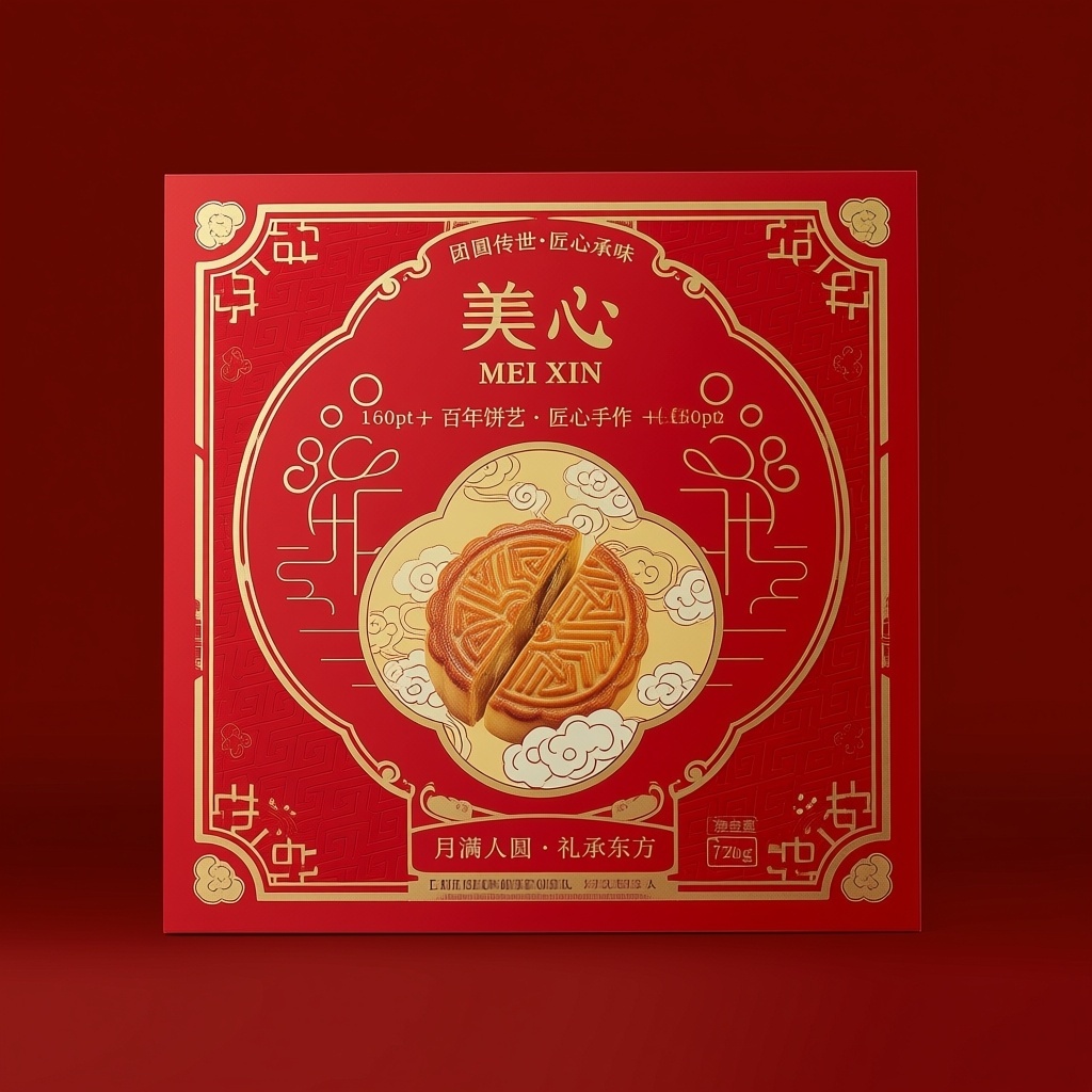 产品:月饼;品牌名:美心;包装样式:精品礼盒,选用高阶哑光红卡纸搭配烫金工艺,触感细腻厚重;包装营销卖点:以“团圆传世·匠心承味”为核心,融合传统纹样演绎东方礼韵;包装主视觉面排版:采用上下排版,主标题“美心”居上,字体为楷体加粗60pt,副标题“MEI XIN”衬于其下15pt,二级文字宣传语1“百年饼艺 匠心手作”+宣传语2“月满人圆 礼承东方”分列左右各12pt,净含量“720g”置于右下角图标内8pt;设计元素图案背景层为暗红底压印金色回纹肌理,主图案为中央圆形工笔风月饼剖面图配祥云缭绕,边缘环绕传统窗棂式装饰边框,四角嵌入小金箔云纹图标,整体构图对称庄重;设计风格:大气典雅风;主题配色:正红为主,鎏金为辅。