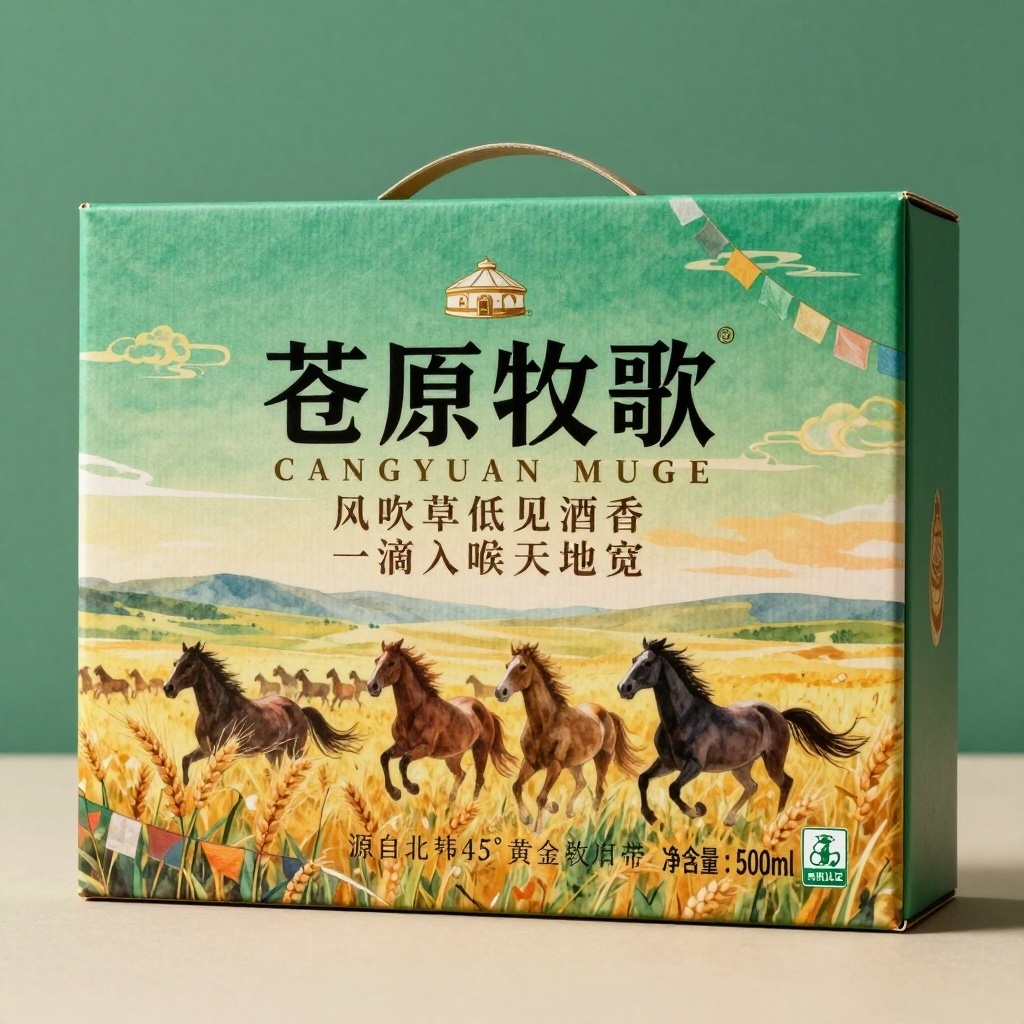 产品:草原浓香型白酒;品牌名:苍原牧歌;包装样式:牛皮纸瓦楞纸箱,表面哑光触感模拟草原粗粝质感;包装营销卖点:以“源自北纬45°黄金牧草带”为核心,强调原料产地纯净与酿造生态;包装主视觉面排版:满版排版,一级文字“苍原牧歌”黑体粗字60pt居中压于画面,“CANGYUAN MUGE”拼音衬底20pt,二级文字“风吹草低见酒香”+“一滴入喉天地宽”各12pt分列上下,三级文字“净含量:500ml”及“有机认证”图标置于右下角8pt。设计元素:背景层为渐变青绿至土黄的辽阔草原地平线,主图案采用写实水彩风奔马群剪影掠过金色麦浪,装饰图案含飘动经幡纹与云朵轮廓,小图标为蒙古包与酒坛组合徽章;设计风格:自然粗犷融合民族符号,强调地域文化沉浸感;主题配色:主色青草绿、辅色落日金。