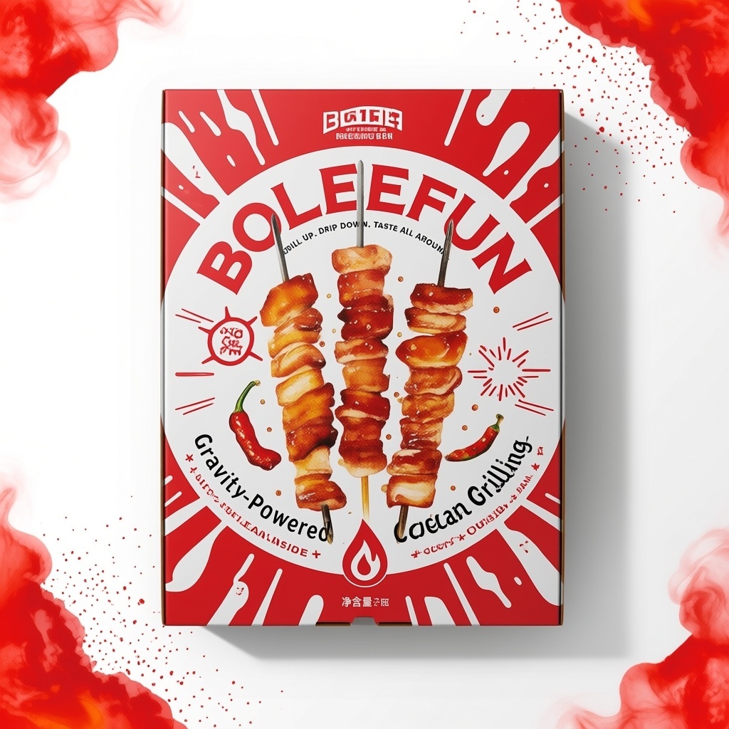 产品:BBQ Vertical Skewer Pan;品牌名:Boleefun;包装样式:纸箱礼品盒,选用高克重环保哑光白卡纸,触感细腻具高级肌理;包装营销卖点:垂直悬烤黑科技,油脂自滤零回沾——烟火风味,健康无负累;包装主视觉面排版:环绕式排版,主标题“BOLEEFUN”粗衬线体48pt居中如印章般压阵,副标题“Grill Up. Drip Down. Taste All Around.”纤细无衬线体9pt环形包绕其外,二级宣传语“Gravity-Powered Clean Grilling”+“Juicy Outside, Lean Inside”分列上下弧线各7pt,净含量嵌于底部火焰滴油图标内;设计元素图案背景层为纯白基底叠加极淡红炭火粒子噪点,中央主图案采用写实水彩风绘制三支垂直串烧五花与鸡翅,焦糖色脆皮透出晶莹肉汁,油珠悬垂动态逼真,四周放射状装饰抽象辣椒圈、孜然爆裂图形与金属支架虚线,四角嵌入半透明红色烟雾状色块强化热力氛围;设计风格:简约大气融合食欲导向型环绕视觉动线;主题配色:主色炽焰红,辅色云缎白。