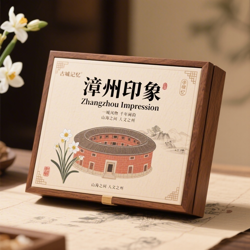 产品:漳州市城市文化礼盒;品牌名:漳州印象;包装样式:长方形木质精品礼盒,表面为哑光原木纹理,触感温润质朴;包装营销卖点:以“古城记忆”为核心,提取漳州土楼、水仙花、闽南红砖古厝为视觉符号,传递地域人文温度;包装主视觉面排版:采用上下排版,主标题“漳州印象”黑体粗字48pt居上,副标题“Zhangzhou Impression”衬线体12pt,下方配二级宣传语“一城风物 千年闽韵”+“山海之间 人文之州”各8pt;背景层为浅米色肌理纸模拟宣纸质感,主图案采用工笔水墨风勾勒土楼轮廓与绽放水仙,辅以闽南窗花纹样作边角装饰,小图标含“非遗”“原产地”篆刻印章式样;设计风格:新中式极简融合在地文化符号,克制留白中见细节层次;主题配色:主色沉木棕,辅色水仙白。