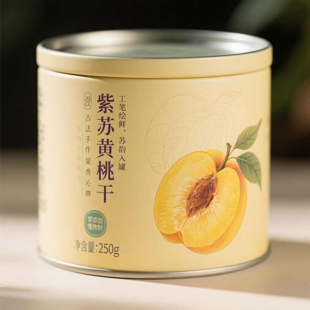 产品:紫苏黄桃干;品牌名:紫苏黄桃干;包装样式:马口铁罐装,表面覆哑光膜显温润质感;包装营销卖点:以“工笔绘鲜,苏韵入罐”唤起手工精制与自然馈赠的双重联想;包装主视觉面排版:覆盖式排版,背景层为淡鹅黄色底叠加若隐若现线描黄桃轮廓纹理,右下方工笔风格饱满黄桃静置,果肉透亮叶脉清晰,左上方竖排主标题“紫苏黄桃干”瘦金体28pt典雅垂列,无副标题,宣传语1“古法手作”+宣传语2“果香沁脾”7pt楷体横向轻缀于罐底边缘,净含量250g嵌于左下角配“零添加·慢熬制”图标;设计风格:东方工笔融合现代极简;主题配色:主色蜜糖黄、辅色青瓷绿。