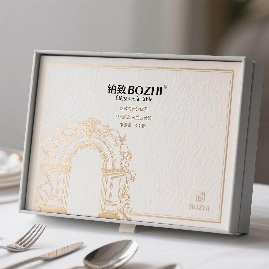 产品:铂致BOZHI 高档西餐具系列三件套礼盒;品牌名:铂致BOZHI;包装样式:天地盖硬盒+外封套,选用高阶哑光灰卡纸搭配烫金纹理内衬;包装营销卖点:以“法式餐桌仪式感”为核心,主视觉提炼巴黎古典银器纹样与极简线条融合;包装主视觉面排版:上下排版,主标题“铂致BOZHI”黑体粗字48pt居顶,副标题“Élégance à Table”衬线体12pt;二级文字“盛放时光的优雅”+“刀叉间的法兰西诗篇”各8pt;三级文字“净含量:3件套”及刀叉勺小图标6pt。背景层为米白肌理纸纹,主图案采用工笔风蚀刻巴黎拱廊剪影,装饰图案含抽象藤蔓金线浮雕纹,边缘点缀极细香槟金分割线,右下角嵌入餐具轮廓微标;设计风格:法式轻奢·极简高级,强调留白与金属质感对比;主题配色:主色香槟金,辅色雾霭灰。