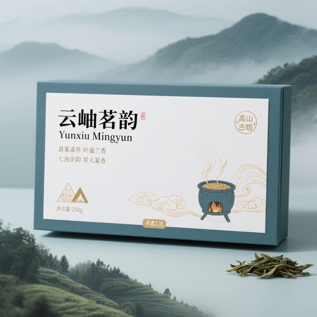 产品:铁观音茶叶;品牌名:云岫茗韵;包装样式:长方形精品礼盒,选用哑光触感纸材质,表面细腻柔韧;包装营销卖点:以“山雾晨露·古法炭焙”为核心概念,突出原产地安溪高山云雾环境与传统工艺;包装主视觉面排版:上下排版,主标题“云岫茗韵”黑体粗字48pt居上,副标题“Yunxiu Mingyun”衬线体12pt,二级文字“晨雾滋养 叶蕴兰香”+“七泡余韵 炭火凝香”各8pt,三级文字“净含量:250g”及山形认证图标内标“非遗工法”;设计元素图案背景层为淡青灰渐变模拟山岚,主图案用工笔风绘制安溪茶山晨景配炭焙炉具,装饰图案含飘散茶叶与云纹烫金线条,小图标为圆形印章式“高山·古焙”篆体字;设计风格:新中式雅致风,融合传统水墨意境与现代极简留白;主题配色:主色黛青、辅色月白。