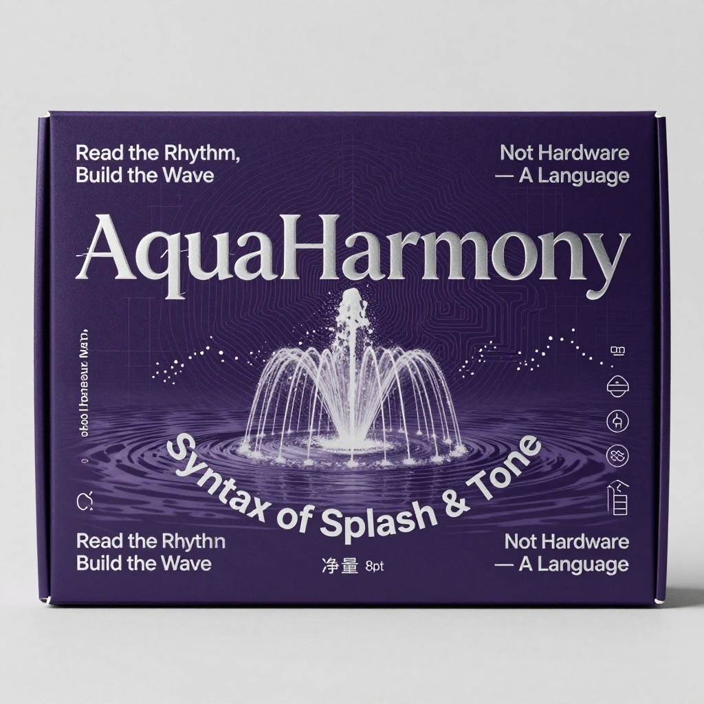 产品:音乐喷泉零件;品牌名:AquaHarmony;包装样式:长方形精品礼盒,采用磁控溅射镀膜纸板,表面随视角流转呈现液态金属光泽;包装营销卖点:以“声波拓扑·水之语法”为核心,用抽象符号系统重构喷泉动态为可阅读的视觉诗学;包装主视觉面排版:以文字为主式排版,主标题“AquaHarmony”使用算法生成断裂衬线体78pt居中悬浮,字母间隙透出底层动态频谱,副标题“Syntax of Splash & Tone”20pt呈非对称弧线环绕标题底部,宣传语1“Read the Rhythm, Build the Wave”与宣传语2“Not Hardware — A Language”各6pt垂直嵌入左右隐形导电墨区,净含量8pt微凸于底边中央;背景层为混沌方程生成的非周期水纹矩阵,主图案采用音频数据驱动的抽象几何曲面,风格属符号主义数字雕塑风,装饰图案含声码粒子沿斐波那契路径漂浮,小图标含语义校准标、空间编译符、触觉反馈ID;设计风格:声流符号解构风;主题配色:主色暗码深空紫,辅色液态数据银。