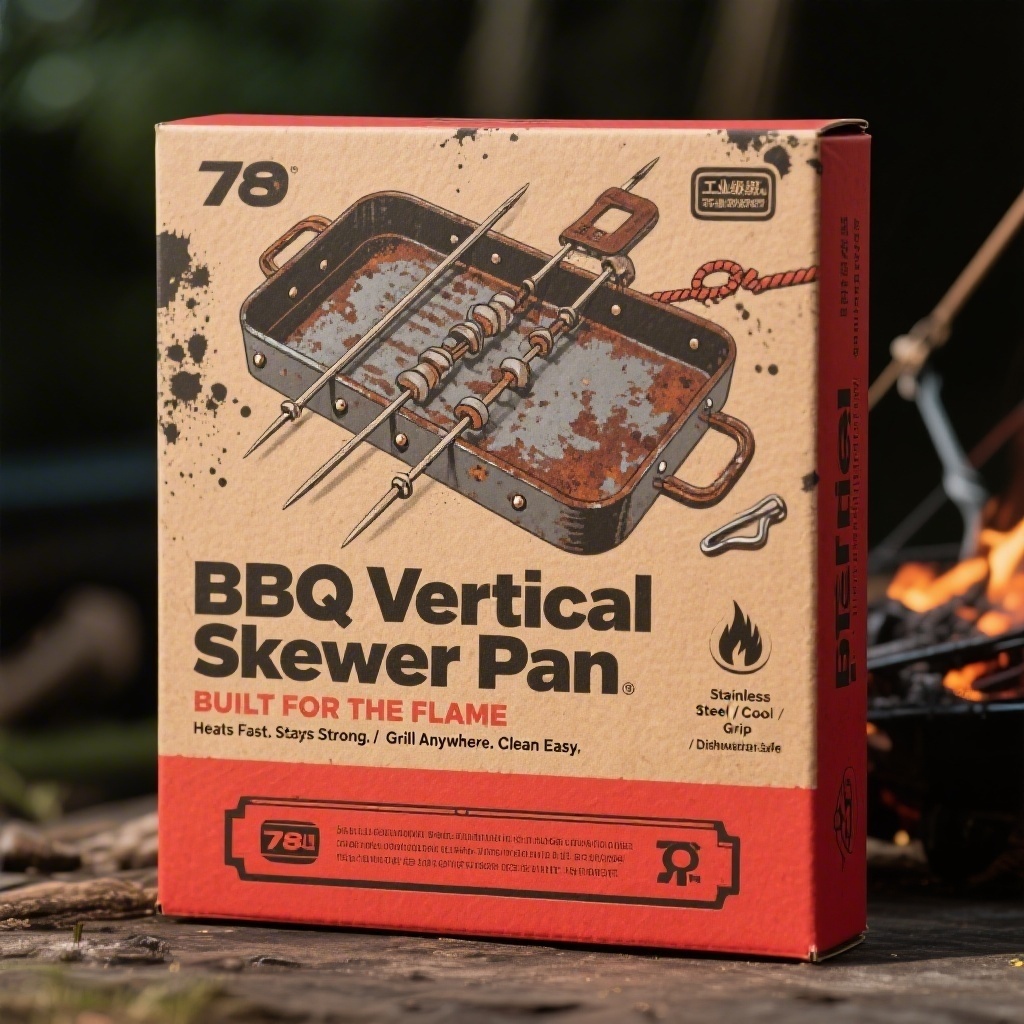 产品:BBQ Vertical Skewer Pan;品牌名:BBQ Vertical Skewer Pan;包装样式:长方形彩盒,尺寸430x330x95mm,选用粗面牛皮纸基材叠加局部UV工艺;包装营销卖点:以“工业级野营装备”定位强化坚固耐用与户外专业属性;包装主视觉面排版:采用上下排版,上部为粗粝线稿风垂直烤叉主图案搭配铆钉与金属接缝细节,背景层模拟做旧铁板锈迹与炭灰泼溅肌理,装饰图案含登山扣、露营绳结与火焰剪影,小图标为“Stainless Steel / Cool Grip / Dishwasher Safe”工业标牌样式;一级文字主标题“BBQ Vertical Skewer Pan”重型无衬线体78pt嵌入仿钢板凹槽,副标题“BUILT FOR THE FLAME”26pt;二级文字宣传语1“Heats Fast. Stays Strong.”+宣传语2“Grill Anywhere. Clean Easy.”机械字体13pt横置于底部工具箱式色块条内;三级文字净含量与完整英文段落以10pt等宽打字机字体纵向排列于右侧;设计风格:粗犷工业风融合户外野营元素,结构硬朗信息分层清晰;主题配色:主色熔岩红,辅色机油黑。