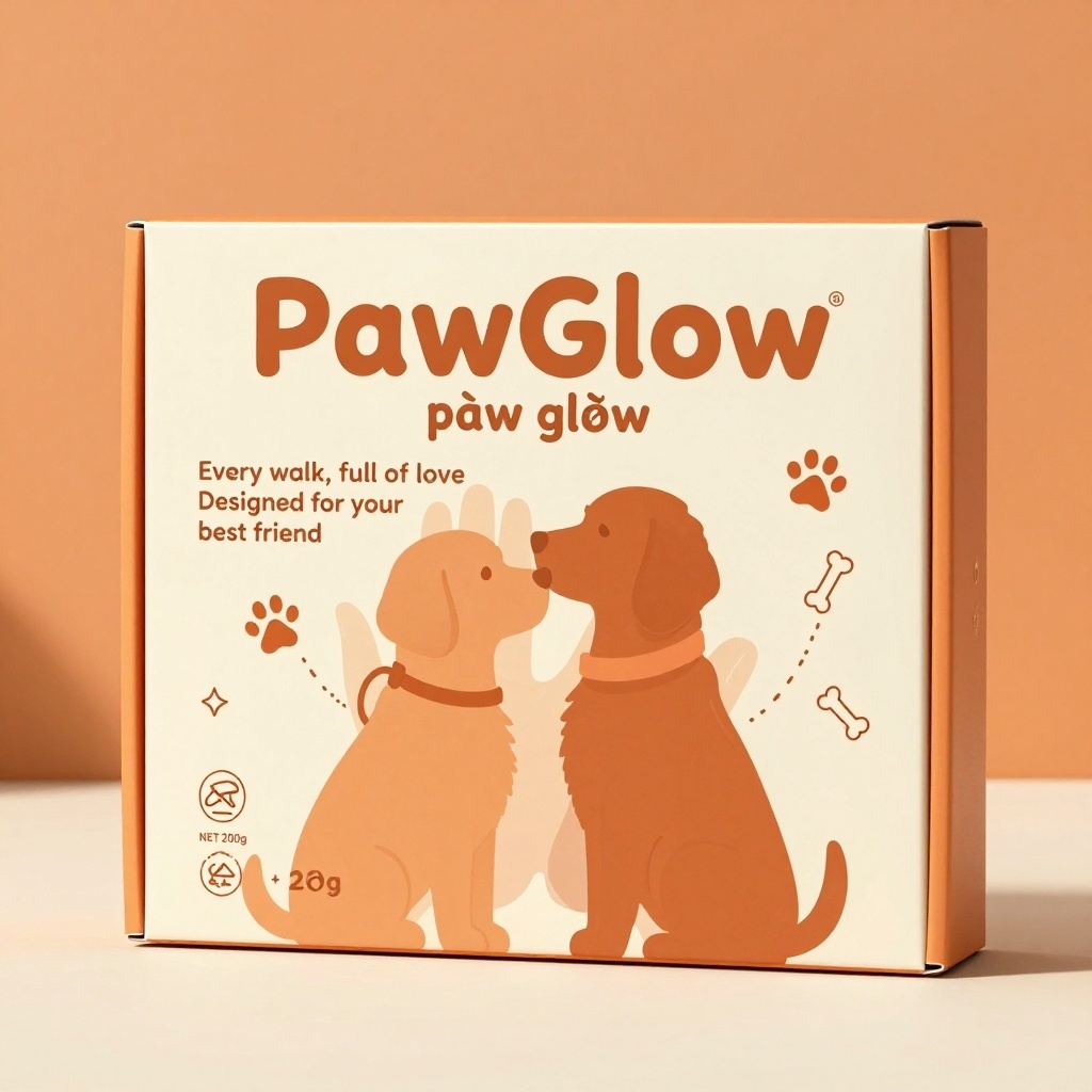 产品:宠物项圈;品牌名:PawGlow;包装样式:长方形精品礼盒,尺寸180×120×50mm,采用厚实哑光艺术纸,触感温润细腻;包装营销卖点:以“陪伴是最温柔的守护”为情感核心,用萌宠剪影与主人手部轮廓交叠构成主视觉,传递温暖羁绊;包装主视觉面排版:上下排版,主标题“PawGlow”居上,副标题“pàw glōw”小字衬底,字体为圆润无衬线体36pt与9pt;二级文字“Every walk, full of love”+“Designed for your best friend”字号6pt;三级文字含净含量图标“NET 200g”及安全认证标;设计元素背景层为低饱和奶油肌理,主图案为扁平插画风格双犬剪影依偎于掌心轮廓中,装饰图案含飘散爪印与爱心轨迹,小图标含骨头、牵引绳、星星等极简线描符号;设计风格:现代治愈系插画风,柔和线条搭配情感化构图;主题配色:暖懒橙+象牙白。