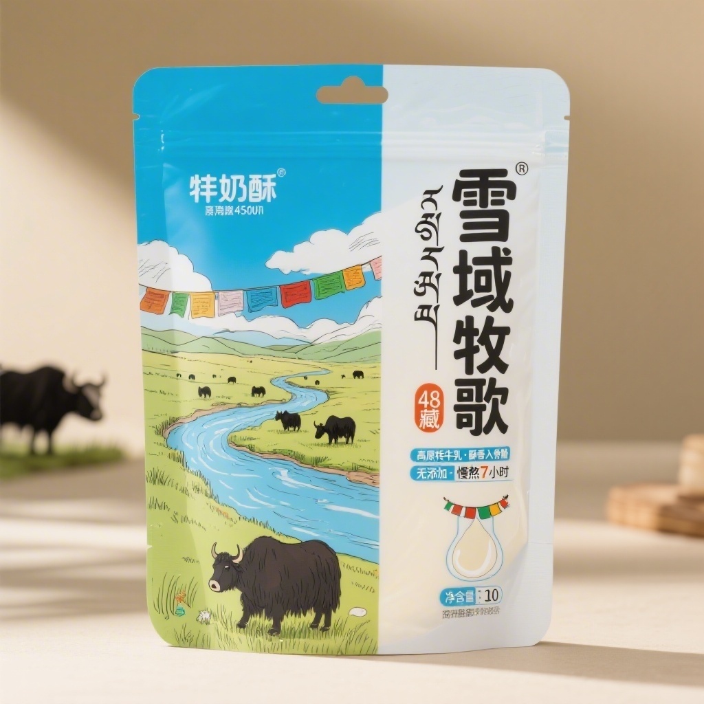 产品:牦牛奶酥;品牌名:雪域牧歌;包装样式:食品自立袋,采用哑光质感复合塑料膜,底部设透明视窗展示内容物;包装营销卖点:源自海拔4500米纯净高原牧场,每一口都是自然馈赠;包装主视觉面排版:采用左右排版,左侧为手绘风高原草场景观——蓝天白云下蜿蜒河流、零星牦牛群与飘扬五彩经幡构成粗粝线稿风格主图,右侧竖排主标题“雪域牧歌”黑体粗字48pt配藏文副标,下方两行宣传语“高原牦牛乳·酥香入骨髓”“无添加·慢熬7小时”各10pt,净含量标注于右下角,搭配奶滴与经幡小图标;设计风格:藏地人文自然融合插画风,背景层以渐变天蓝过渡至草绿,装饰图案含飘动经幡纹理与牦牛剪影,点缀金色云纹线条;主题配色:主色高原天蓝+辅色酥酪奶白。