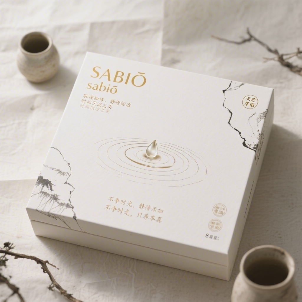 产品:高端护肤精华液与面霜礼盒;品牌名:SABIŌ;包装样式:长方形精品礼盒,纯白哑光艺术纸,触感温润如宣纸;包装营销卖点:以“时间沉淀之美”为核心,融合日式侘寂哲学,强调成分天然与肌肤共生;包装主视觉面排版:上下排版,主标题“SABIŌ”烫金无衬线粗体48pt居上,副标题“sabiō”小写衬线体10pt轻缀其下,宣传语1“肌理如诗,静待绽放”与宣传语2“不争时光,只养本真”分列两侧8pt纤细手写体,净含量标注于右下角6pt极细黑体;背景层为手工宣纸肌理晕染,主图案为枯山水涟漪工笔风线描,中央悬浮一滴透明水珠插画象征精华纯粹,四角饰以残缺陶器轮廓线稿,边缘辅以枯枝水墨笔触,小图标含“天然萃取”“零添加”双章;设计风格:极简侘寂美学,克制留白与自然残缺感并存;主题配色:主色雪落白,辅色古金箔。