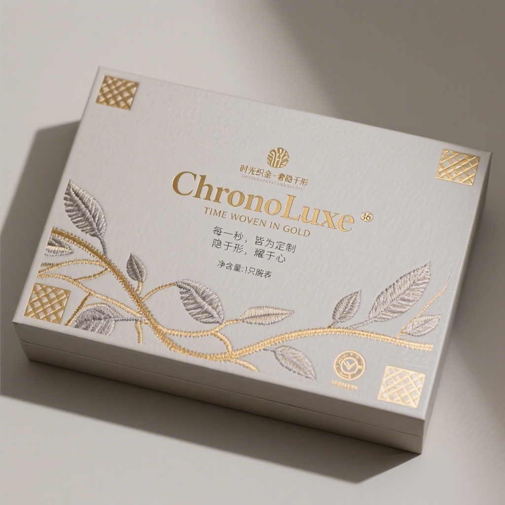 产品:高档机械腕表;品牌名:ChronoLuxe;包装样式:长方形精品礼盒,采用高克重哑光艺术纸覆触感膜,温润如丝绒;包装营销卖点:以“时光织金·奢隐于形”为核心概念,将高级时装刺绣工艺转化为视觉语言,传递低调奢华与时间艺术的融合;包装主视觉面排版:上下排版,主标题“ChronoLuxe”居上,衬线体36pt烫哑金,副标题“TIME WOVEN IN GOLD”无衬线体8pt压印灰;二级文字“每一秒,皆为定制”+“隐于形,耀于心”各6pt纤细无衬线体分列左右;三级文字“净含量:1只腕表”及认证图标置于右下角。设计元素:背景层为香槟灰哑光基底,中央铺展抽象藤蔓金线浮雕纹,风格为极简新古典线描风,边缘饰以若隐若现的茛苕叶暗纹压印,四角嵌入几何编织小图标,局部亮面金属箔与哑光材质形成光影对峙;设计风格:新奢主义极简浮雕风;主题配色:香槟灰 + 缎金色。