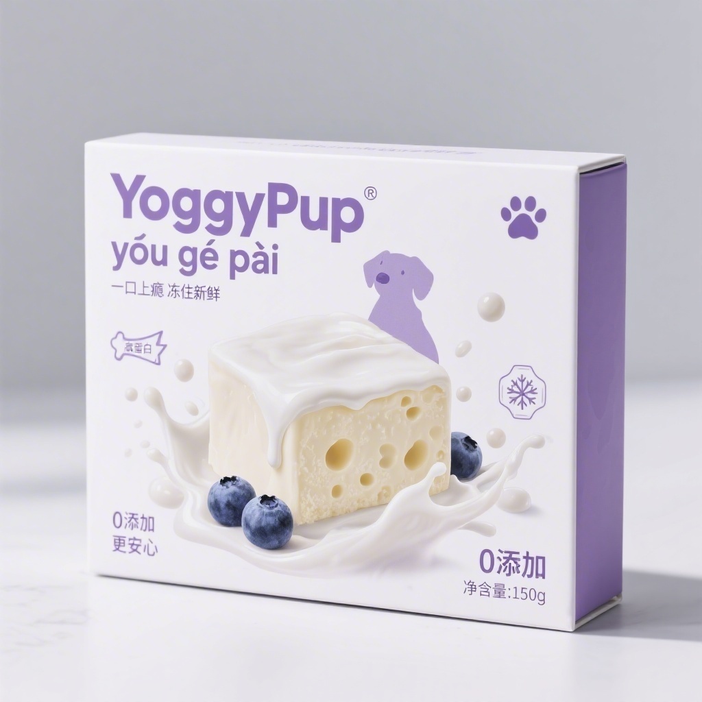 产品:犬用冻干酸奶砖;品牌名:YoggyPup优格派;包装样式:长方形精品礼盒,200x110mm,选用哑光触感纸搭配局部UV工艺,呈现柔滑奶霜质感;包装营销卖点:以“食欲诱惑力”为核心,主视觉采用融化流淌的酸奶砖剖面特写,搭配飞溅奶珠与萌犬剪影,激发视觉食欲;包装主视觉面排版:满版排版,一级文字“YoggyPup”粗体无衬线字60pt+拼音副标题“yōu gé pài”28pt居中压于酸奶流心上方,二级文字“一口上瘾 冻住新鲜”“0添加 更安心”12pt分列左下右下角,三级文字“净含量:150g”置于右上角搭配爪印图标;背景层为柔雾白奶渍肌理,主图案是写实风格剖开酸奶砖插画,内嵌真实奶酪纹理与蓝莓果粒,装饰图案含抽象奶滴波纹与骨形边框,小图标含“高蛋白”闪电标、“低温锁鲜”雪花标;设计风格:现代轻奢插画风,融合食欲摄影元素与几何留白;主题配色:主色奶油白辅色莓果紫。