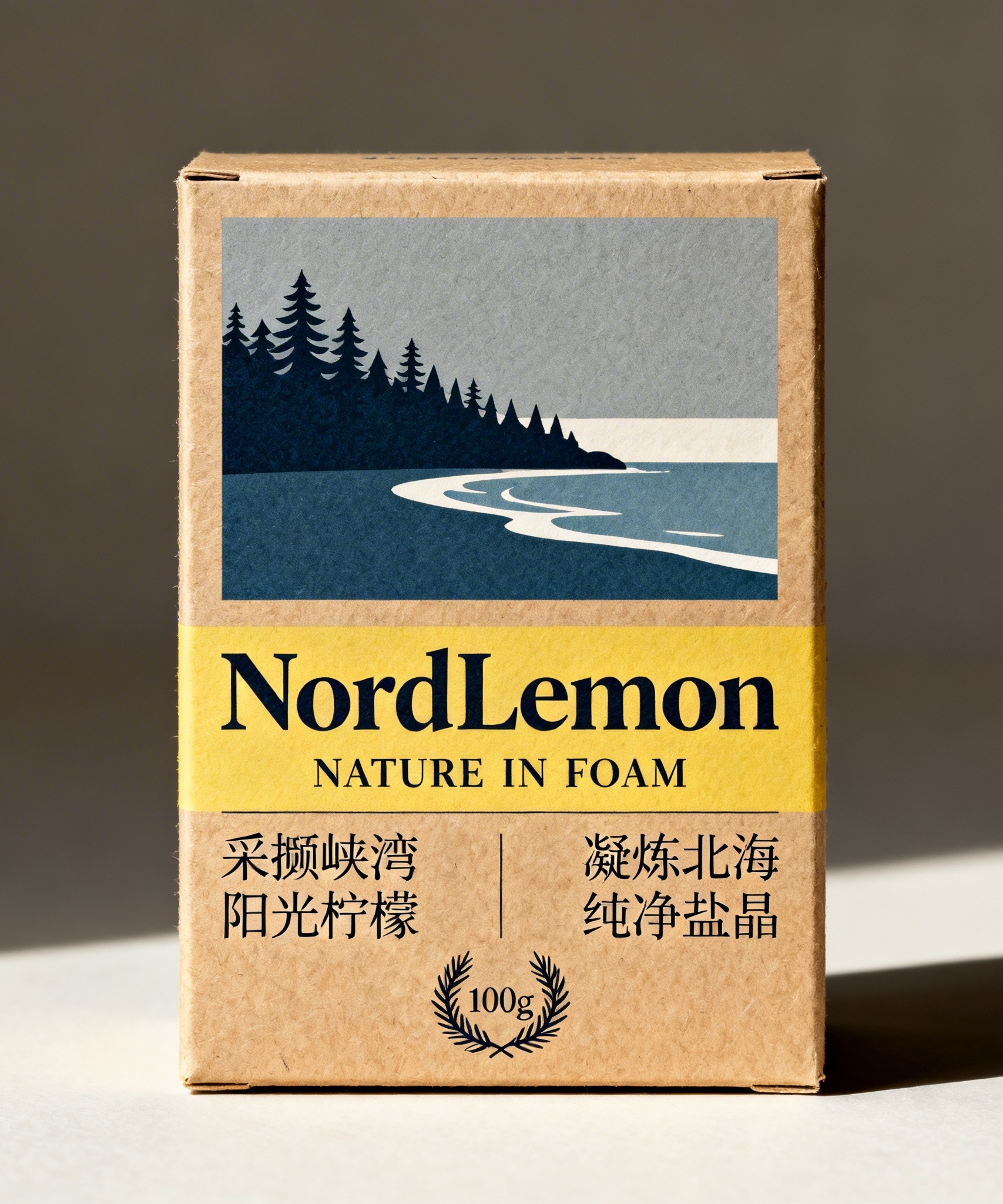 产品:柠檬精油海盐皂;品牌名:NordLemon;包装样式:长方形哑光再生纸礼盒,尺寸10CM×3.3CM×7CM;包装营销卖点:北欧森林与海岸的呼吸感配方,洁净如晨风拂面;包装主视觉面排版:上下排版,上方为极简扁平风主图案,下方文字区含主标题“NordLemon”(衬线粗体28pt)+副标题“NATURE IN FOAM”(无衬线细体6pt),二级文案“采撷峡湾阳光柠檬”+“凝炼北海纯净盐晶”(手写衬线体5pt)分列左右,底部净含量“100g”嵌于松枝环绕小图标内;设计元素背景层为米白再生纸肌理晕染浅灰水纹,主图案是单线勾勒的完整柠檬轮廓叠加半透明白色浪形,采用北欧自然插画风格,点缀三粒几何盐晶与一枚简约松果装饰图形,无边框线条,左上角含环保认证叶形图标;设计风格:北欧极简自然风;主题配色:雾灰蓝+原木黄。