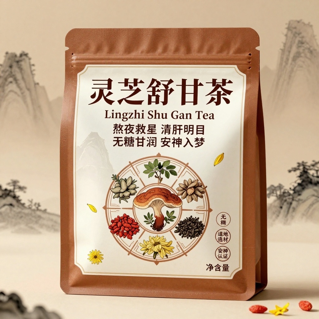 产品:灵芝舒甘茶;品牌名:舒甘源;包装样式:长方形纸质手提袋,选用哑光牛皮纸材质,触感温润环保;包装营销卖点:以“草本护肝·自然安神”为核心,突出六大道地药材协同养肝功效;包装主视觉面排版:上下排版,主标题“灵芝舒甘茶”楷体加粗48pt居上,副标题“Lingzhi Shu Gan Tea”衬线体12pt,二级宣传语1“熬夜救星 清肝明目”+宣传语2“无糖甘润 安神入梦”黑体8pt,净含量标注于右下角;设计元素图案:背景层为浅赭色水墨晕染山林意境,主图案采用工笔风绘制六味药材环绕灵芝的圆形图腾,装饰图案为飘散的菊花瓣与枸杞果实点缀四角,小图标含“无添加糖”“道地选材”“安神认证”三枚朱砂印章式标识;设计风格:东方禅意养生美学;主题配色:主色赭石棕,辅色月牙白。