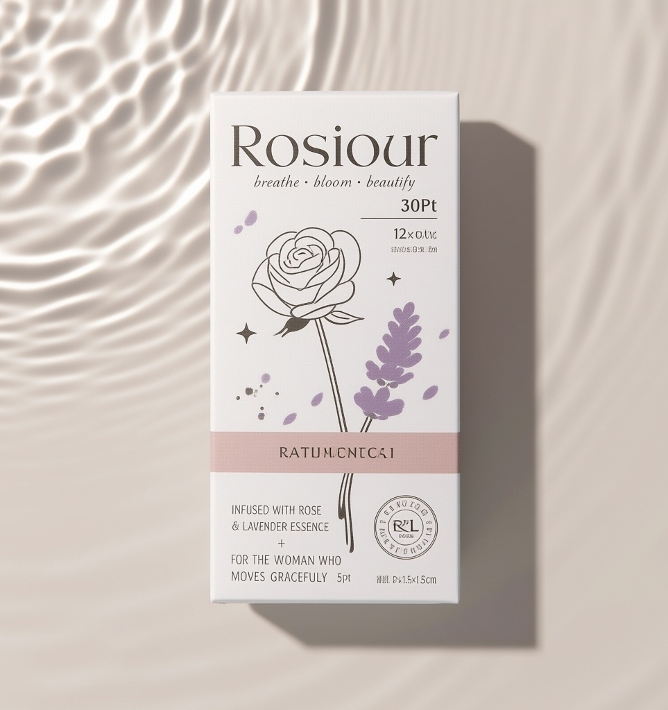 产品:美甲护理笔;品牌名:Rosiour;包装样式:12×1.5×1.5cm 细长纸盒,选用柔韧环保白棉纸,微纹理触感温润;包装营销卖点:呼吸式香氛设计——让每一次涂抹都像被花香轻吻;包装主视觉面排版:覆盖式排版,主标题“Rosiour”居中无衬线粗体30pt,副标题“breathe · bloom · beautify”小写手写体6pt悬浮其下,宣传语1“Infused with Rose & Lavender Essence”+宣传语2“For the Woman Who Moves Gracefully”字号5pt沿底部对齐,净含量嵌于右下角;设计元素图案:背景层为极淡米灰水波纹肌理,主图案采用留白插画风,仅绘一茎斜垂玫瑰与半朵侧影薰衣草,花瓣以0.5pt细墨勾边不填色,装饰图案为空气感飘点与0.8cm宽横向雾带,小图标含香型缩写“R/L”及“Gentle Care Formula”认证标;设计风格:日系自然主义图文呼吸排版,空灵不失精致;主题配色:素麻白为主,晨雾粉为辅。