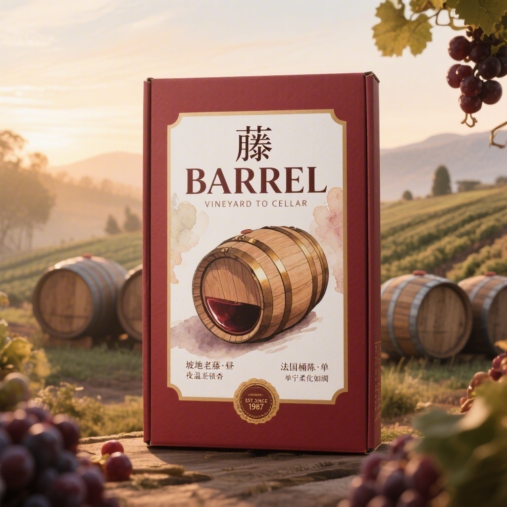 产品:干红葡萄酒;品牌名:藤 Barrel 庄园;包装样式:牛皮纸飞机盒,选用厚质压纹牛皮纸,触感粗朴带天然纤维肌理;包装营销卖点:葡萄园坡地采收,橡木桶窖藏升华;包装主视觉面排版:满版排版,背景为水彩晕染的晨曦葡萄园与朦胧橡木桶群轮廓,主标题“藤 BARREL”粗衬线体52pt居中压于画面,文字底衬半透明白色哑光块增强识别,副标题“VINEYARD TO CELLAR”细衬线体10pt紧贴其下,二级文案左“坡地老藤·昼夜温差锁香”右“法国桶陈·单宁柔化如绸”,7pt等宽无衬线分列标题两侧;主图案采用写实插画风描绘倾斜葡萄园衔接剖开橡木桶内部酒液微光,桶箍延伸为装饰金线贯穿四角,底部嵌徽章式小标“EST.SINCE 1987”;设计风格:高端酒类叙事视觉,图文强融合、层次分明;主题配色:主色深绛红,辅色橡木原棕。