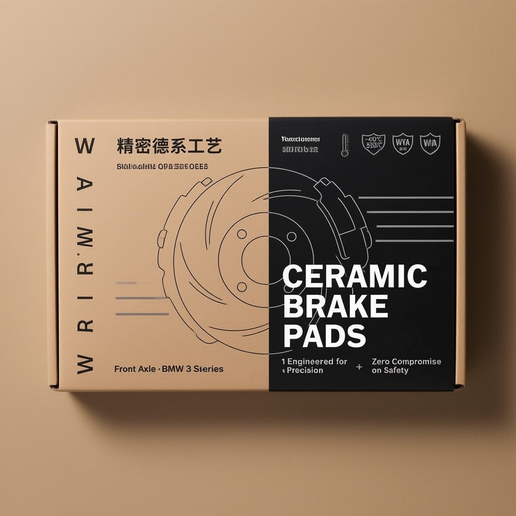 产品:刹车片;品牌名:Warwick;包装样式:长方形礼品盒,采用哑光牛皮纸材质,触感温润且具工业质感;包装营销卖点:以“精密德系工艺”为核心,强调产品在极端温度下的稳定表现与适配车型的专业性;包装主视觉面排版:左右排版,左侧竖排极细字体“W A R W I C K”,右侧黑色哑光UV色块承载白色大字“CERAMIC BRAKE PADS”,底部小字标注适配车型“Front Axle · BMW 3 Series”,主标题字号72pt无衬线纤细体,宣传语1“Engineered for Precision”+宣传语2“Zero Compromise on Safety”字号16pt置于色块右下角;设计元素图案背景层为天然牛皮纸肌理,主图案为抽象化的刹车盘轮廓线稿风嵌入色块右上角,装饰图案含三道平行极细灰线模拟制动轨迹,小图标含温度区间“-40°C to 550°C”盾形认证标与WVA编号徽章;设计风格:德式功能主义极简风;主题配色:牛皮纸原色 + 哑光黑。