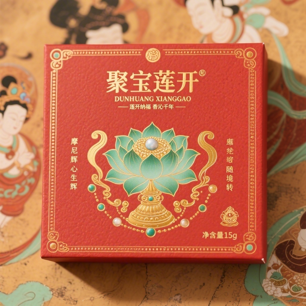 产品:香膏;品牌名:敦煌;包装样式:长方形精品礼盒,纸张选用高克重艺术纸带细微肌理感;包装营销卖点:以敦煌壁画“聚宝莲开”神话意象为核心视觉,传递吉祥纳福、香韵通灵的文化寓意;包装主视觉面排版:满版排版,一级文字“聚宝莲开”居中烫金大字宋体48pt,副标题“DUNHUANG XIANGGAO”衬于其下12pt细黑体,二级文字宣传语1“莲开纳福 香沁千年”+宣传语2“摩尼生辉 心随境转”分列左右各9pt楷体,三级文字“净含量15g”与佛教七宝小图标置于右下角6pt仿宋;设计元素为背景层土黄渐变仿壁画剥落纹理,主图案是工笔风宝相莲花托摩尼珠,花瓣石绿描金卷曲如聚宝盆,飞天飘带与缠枝纹环绕流转,装饰图案含连珠纹边框与散落璎珞,金色线条勾勒所有轮廓强化烫金反光;设计风格:敦煌古典工笔重彩融合现代极简留白;主题配色:朱砂红与鎏金色。