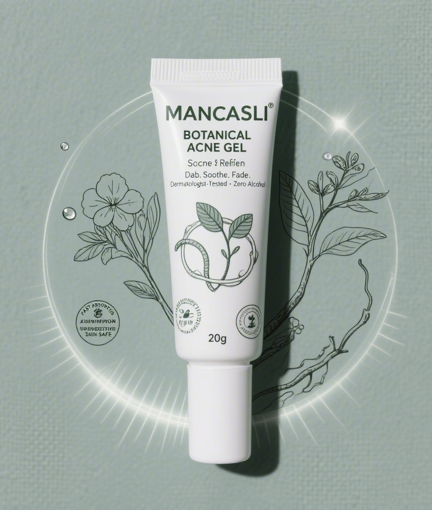 产品:Acne Relief Gel;品牌名:mancasli;包装样式:哑光铝塑复合软管,触感细腻防滑;包装营销卖点:Spot-On Botanical Repair — Targets redness & blemishes overnight with plant-powered actives;包装主视觉面排版:以文字为主式排版,主标题“MANCASLI”超粗无衬线体42pt居中霸屏,副标题“BOTANICAL ACNE GEL”细等宽体8pt悬于其下,二级文案“Dab. Soothe. Fade.” + “Dermatologist-Tested • Zero Alcohol”极细小写无衬线6pt分置标题左右下方,净含量“20g”嵌入右下角圆形徽章内;设计元素图案:背景层为灰绿色水洗纹理模拟天然棉麻质感,主图案采用极简插画风格勾勒三株微观植物——积雪草、茶树、金缕梅根茎交缠成环,叶脉以单线描边呈现,装饰图案含底部放射状光晕与顶部飘浮露珠粒子,小图标含“FAST ABSORPTION”“SENSITIVE SKIN SAFE”双认证标贴于左下;设计风格:现代药妆实验室风融合有机自然语汇;主题配色:主色石板灰绿、辅色冷雾白。