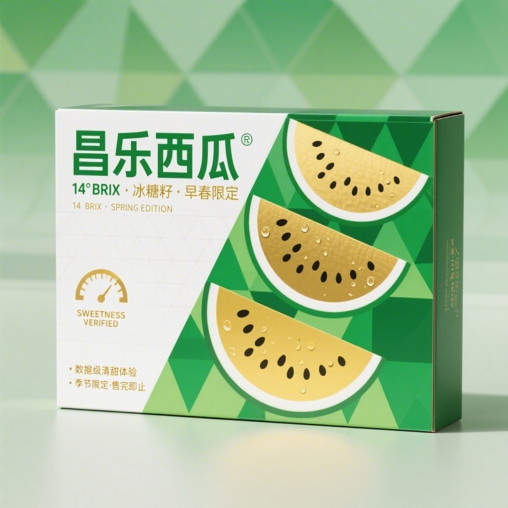 产品:昌乐西瓜;品牌名:昌乐西瓜;包装样式:长方形精品礼盒,环保再生纸板哑光压纹质感;包装营销卖点:“14°甜·冰糖籽·早春限定”,以科学甜度与自然稀缺驱动购买;包装主视觉面排版:几何抽象图文构成风,主标题“昌乐西瓜”无衬线超粗体42pt居中压轴,副标题“14° BRIX · SPRING EDITION”8pt细体横向悬浮其下,背景层为翠绿渐变三角网格底纹,主图案为三组抽象化西瓜切片——由金黄扇形色块+黑色籽点阵列+露珠白圈构成,呈阶梯式左对齐排列于右侧,左侧留白区嵌入金色仪表盘图标+“SWEETNESS VERIFIED”,宣传语1“数据级清甜体验”+宣传语2“季节限定·售完即止”各6pt垂直排列于左下角;设计风格:现代几何抽象+高识别度图文系统;主题配色:翠绿+金黄。