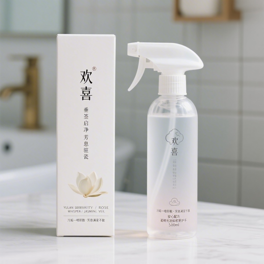 产品:浴室清洁喷雾;品牌名:欢喜;包装样式:透明磨砂瓶身,握颈内收防滑,自肩至底纵向热压贴合2.8cm宽液感素缎垂签——高密度涤纶混纺哑光涂层,触感如浸水丝绸,边缘热熔封边零溢出;包装营销卖点:以“垂签启净 芳息驻瓷”为香氛洁净仪式,将浴室清洁转化为母亲轻拂瓷砖、香气沁室的静谧时刻;包装主视觉面排版:纵向书脊式布局,主标题“欢喜”瘦金体90pt垂直居中墨色锐利,副标题“YULAN SERENITY / ROSE WHISPER / JASMINE VEIL”无衬线18pt字重700悬于签尾间距3mm远距可辨,宣传语“污垢一喷即散·芳息满室不散”+“安心配方 瓷砖光洁如初更护手”仿宋加粗13pt分列签身左右内距5mm精准对齐,净含量500ml藏于签首云章内微凸UV清晰呈现;背景层透明磨砂瓶体透现液体色泽,玉兰款缎签月白灰配松烟墨+瓶底激光雕单朵玉兰符章,玫瑰款雾玫瑰灰配胭脂墨+单瓣玫瑰章,茉莉款雾月白灰配松烟墨+单朵茉莉章;设计风格:新中式极简香氛叙事,靠材质、色系、符章三重编码区分香型,文案聚焦“洁净+留香+护材”;主题配色:玉兰款—透明磨砂瓶+月白灰缎签配松烟墨 / 玫瑰款—透明磨砂瓶+雾玫瑰灰缎签配胭脂墨。