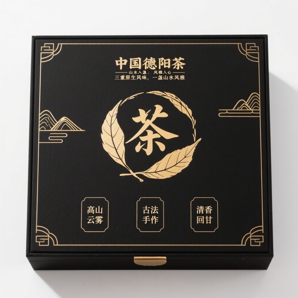 产品为中国德阳茶,品牌名为“中国德阳茶”,包装样式为精装抽屉盒,纸张选用高克重哑光黑卡纸,触感细腻沉稳。包装营销卖点为“三重原生风味,一盏山水风雅”,突出产地生态与品饮意境。主视觉面采用满版排版,背景层为纯白底衬托极简气质,中央悬浮巨大圆形金箔“茶”字图腾,采用工笔水墨风茶叶缠绕圆周,叶脉纤毫毕现;下方错落排布三个浅金线框图标,内含文案“高山云雾”“古法手作”“清香回甘”,字体为细宋体8pt;主标题“中国德阳茶”居顶用粗宋24pt,副标题“山水入盏,风雅入心”拼音小字衬底10pt;四角点缀抽象山形金色纹样,边缘压暗金色细线框提升精致度。设计风格为东方极简主义融合现代构成,主题配色以玄黑为主、浅金为辅。