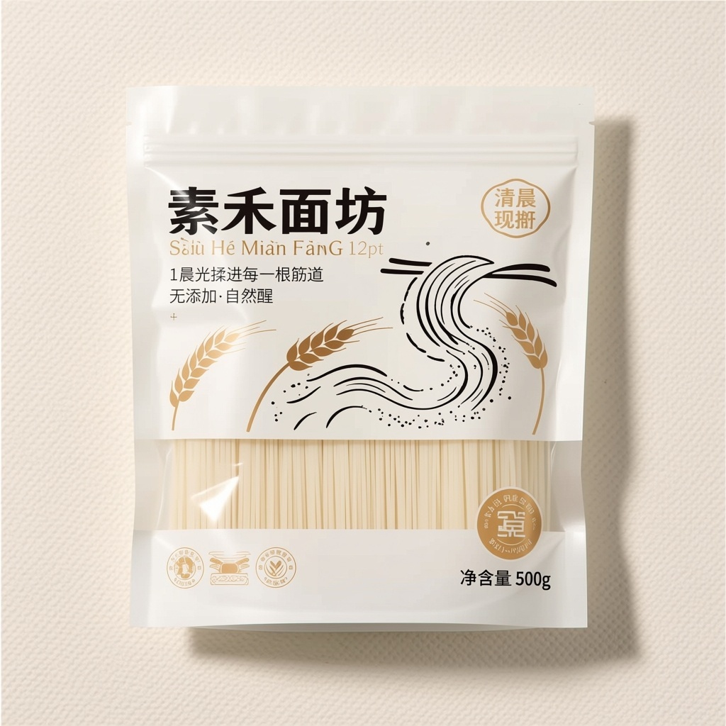 产品:鲜面条;品牌名:素禾面坊;包装样式:食品自立袋,采用哑光珠光纸复合透明PET窗;包装营销卖点:以“清晨现擀”为核心概念,突出手工制作与食材本真;包装主视觉面排版:上下排版,主标题“素禾面坊”黑体粗字48pt居上,副标题“Sù Hé Miàn Fāng”衬线体12pt,宣传语1“晨光揉进每一根筋道”+宣传语2“无添加·自然醒”均为细宋体9pt,净含量“500g”置于右下角图标内。背景层为米白肌理纸纹,主图案是极简水墨风手擀面线条飘动轨迹,工笔勾勒面粉微粒悬浮感,装饰图案为三组淡金麦穗剪影错落分布,小图标含“零添加”“冷藏锁鲜”双认证徽章;设计风格:东方极简主义融合现代轻奢质感;主题配色:主色象牙白、辅色浅檀金。