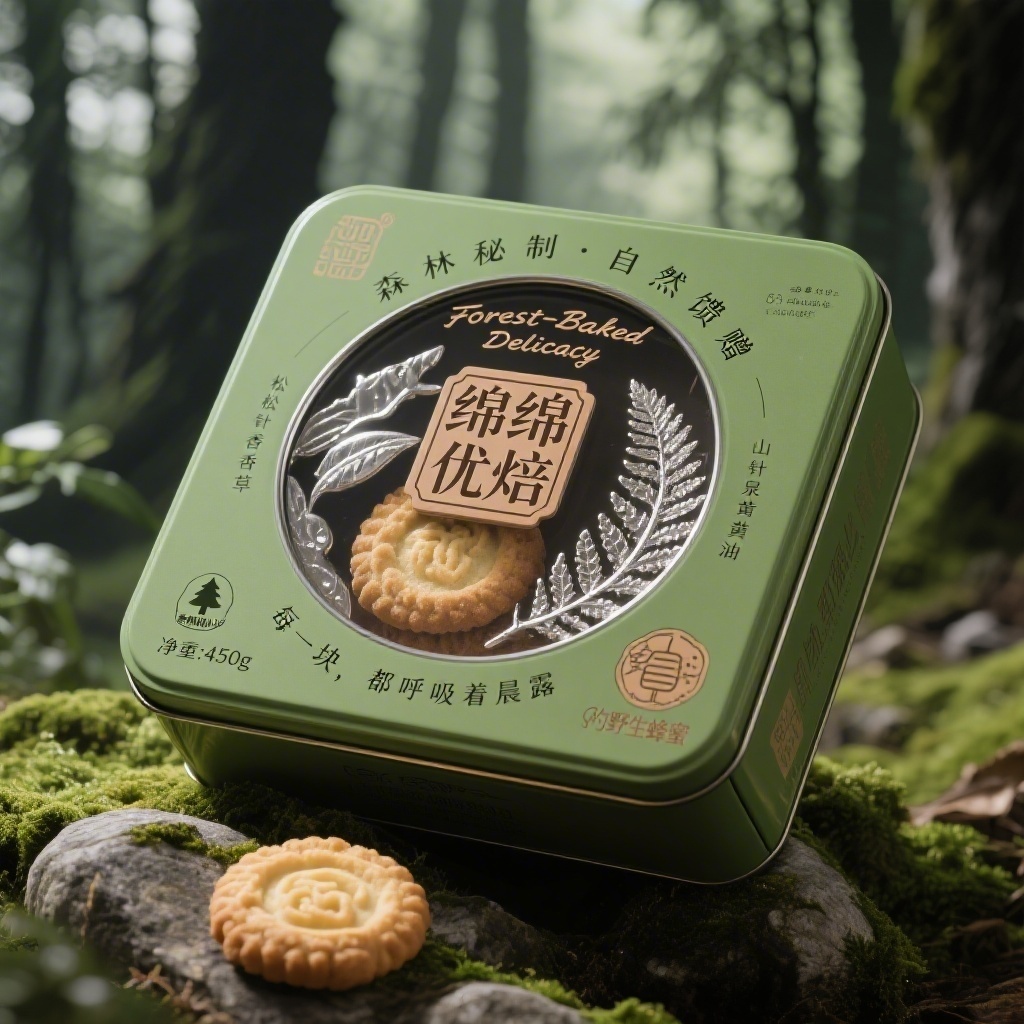 产品:曲奇;品牌名:绵绵优焙;包装样式:开窗铁盒,身开料564.5x196mm、盖开料443x263mm、底开料452x252mm,金属哑光磨砂质感;包装营销卖点:以“森林秘制·自然馈赠”为概念,强调原料源自无染山林与手工慢作;包装主视觉面排版:采用环绕式排版,主标题“绵绵优焙”粗衬线体56pt居中如印章压阵,副标题“Forest-Baked Delicacy”手写斜体10pt环于其周;二级文字“松针香草 · 山泉黄油”+“每一块,都呼吸着晨露”弧形对称分布上下,字号8pt;三级文字含“净重:450g”及图标“🌲林源认证”“🍯野生蜂蜜”。背景层为苔藓绿渐变肌理,主图案为黑白水墨风森林场景,曲奇如石隐于林间,装饰图案为银箔压印蕨类叶脉与露珠轨迹,小图标采用篆刻风格圆形章印;设计风格:东方自然主义融合文人雅趣美学;主题配色:苔藓绿为主,檀木褐为辅。