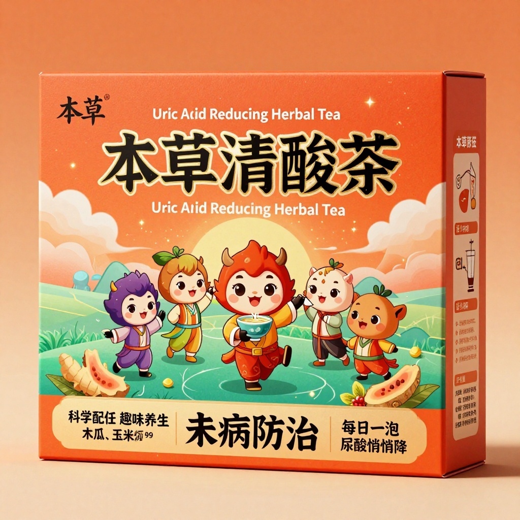 产品:本草清酸茶(降尿酸药食同源中药茶包);品牌名:本草清酸茶;包装样式:长方形精品礼盒,20×8.5×10.5cm,哑光特种纸带微糙草本触感;包装营销卖点:以“紫苏、桔梗、生姜、木瓜、玉米须”拟人化卡通角色为核心视觉资产,结合动物实验权威背书,强化“未病防治·轻症得消·重症得缓·便捷高效·口味极佳”五大消费承诺;包装主视觉面排版:满版排版,主标题“本草清酸茶”粗黑体烫金52pt居中醒目,副标题“Uric Acid Reducing Herbal Tea”无衬线白字12pt压于主图上方,二级文案“科学配伍 趣味养生”+“每日一泡 尿酸悄悄降”各9pt分置左右下角,“未病防治”四句口号用加粗雅黑36pt横排盒底增强记忆;主图案为五味药材化身萌系国潮卡通人物手捧茶碗共舞,背景层为高饱和橘红与青绿渐变药田云海,装饰含粒子光效与经络光纹,左上角“本草”二字放大至24pt书法体强化识别;侧面展示冲泡指南图文步骤,背面列成分功效与实验简报;设计风格:高辨识度国潮卡通科研风;主题配色:主色活力橘红,辅色药原青绿。