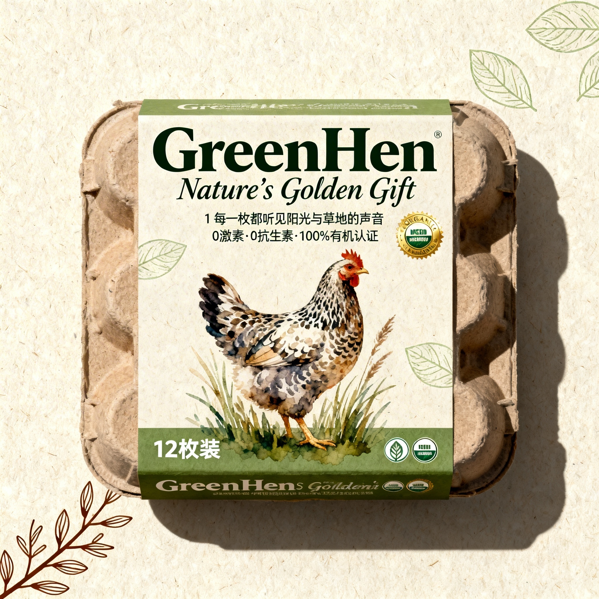 产品:有机鸡蛋;品牌名:GreenHen;包装样式:纸浆鸡蛋盒,采用环保再生纸浆材质,表面保留天然纤维肌理触感;包装营销卖点:每颗蛋都来自自由放养的幸福母鸡,传递自然本真滋味;包装主视觉面排版:上下排版,主标题“GreenHen”粗衬线体36pt居上,副标题“Nature’s Golden Gift”手写体18pt紧随其下,二级宣传语1“每一枚都听见阳光与草地的声音”、宣传语2“0激素·0抗生素·100%有机认证”无衬线体8pt置于中部,净含量“12枚装”及有机认证图标分布底部两侧;设计元素图案:背景层为米色纸浆肌理底纹,中央主图案为水彩天然风手绘芦花母鸡侧影立于草丛间,四周散落淡绿叶脉装饰图案,右上角嵌入烫金质感有机认证徽章小图标,左下角缀以棕色枝条线条勾勒田园氛围;设计风格:简约自然风;主题配色:苔藓绿为主,暖棕为辅。