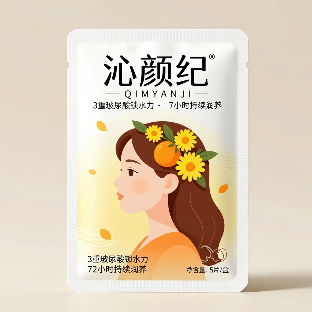 产品:水润面膜;品牌名:沁颜纪;包装样式:竖立白卡盒,选用350g高阶哑光白卡纸,触感柔滑细腻;包装营销卖点:以“侧颜女孩+黄花橙叶”构建视觉记忆点,传递“天然植萃·透亮如初”的核心价值;包装主视觉面排版:上下排版,主标题“沁颜纪”雅黑粗体48pt居上,副标题“QINYANJi”细圆体12pt,二级文字“3重玻尿酸锁水力”“72小时持续润养”各9pt置于主图下方,三级文字“净含量:5片/盒”及水滴/叶片小图标分列右下角;设计元素图案:背景层为暖黄渐变晕染,中央主图案为扁平矢量风侧颜少女轮廓,发丝间缠绕橙色柑橘枝与明黄小雏菊,风格清新治愈,装饰图案含飘散花瓣与水波纹线条,无额外色块,小图标采用极简线描水滴与植物符号;设计风格:现代扁平矢量插画风,强调几何轮廓与柔和渐变;主题配色:主色暖黄、辅色珊瑚橙。