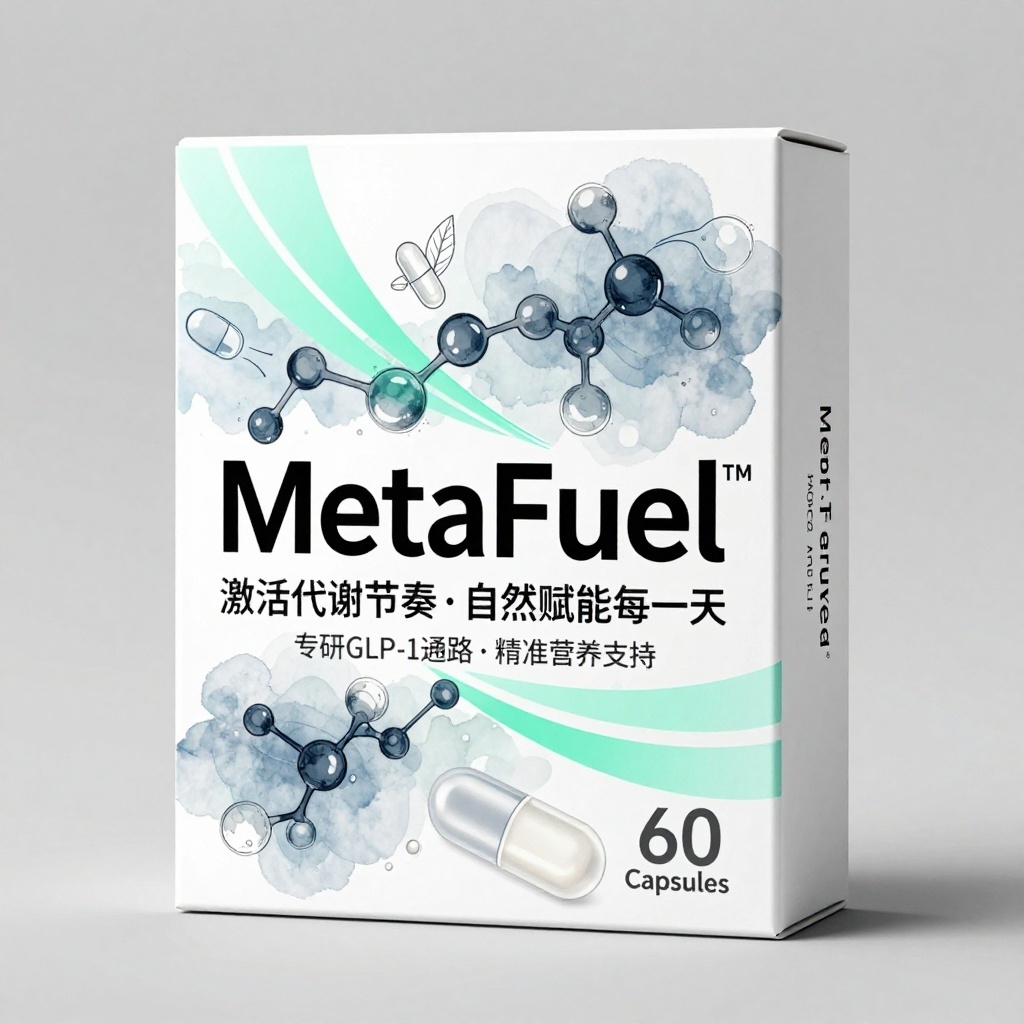 产品:GLP-1营养支持保健品;品牌名:MetaFuel™ — Support Your GLP-1 Journey — Naturally / Smart Nutrition for GLP-1 Users;包装样式:哑光触感白卡纸彩盒;包装营销卖点:以“代谢能量可视化”为核心,将分子结构转化为动态插画语言,传递科学营养的可感知体验;包装主视觉面排版:满版排版——主标题“MetaFuel™”居中粗无衬线体48pt,副标题英文小写10pt环绕其下,宣传语“激活代谢节奏·自然赋能每一天”与“专研GLP-1通路·精准营养支持”分列左右24pt纤细字体,底部“60 Capsules”嵌入半透明胶囊轮廓图标内;设计元素:背景层为手工水彩晕染的冷灰蓝底,主图案为流动感十足的抽象分子链与能量波纹插画风格,采用柔边数字笔刷表现科技有机感,装饰线条含三道由左上至右下贯穿的薄荷绿渐变轨迹,小图标为胶囊、叶脉、齿轮组合的极简线描图形;设计风格:有机科技插画风,融合手绘质感与数据美学;主题配色:主色雾霭蓝与珍珠白,辅色石墨黑与活力薄荷绿。