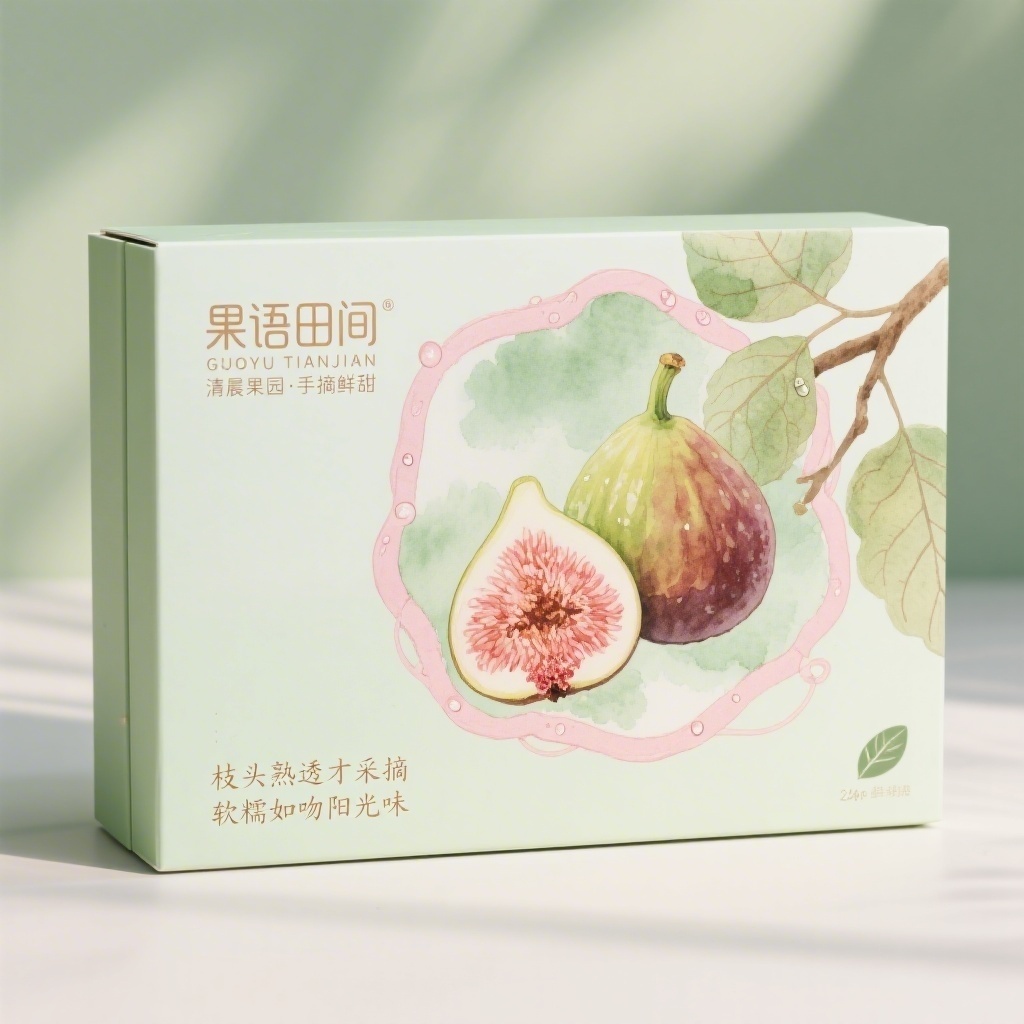 产品:无花果干;品牌名:果语田间;包装样式:长方形精品礼盒,采用250g哑光艺术纸材质,触感温润细腻;包装营销卖点:以“清晨果园·手摘鲜甜”为概念,主视觉聚焦水彩风饱满无花果果实,强化自然馈赠的仪式感;包装主视觉面排版:左右排版,左侧为品牌Logo“果语田间”搭配拼音副标“GUOYU TIANJIAN”,字体纤细衬线体24pt,右侧中央为写实水彩天然风无花果主图案,背景层浅绿晕染如晨雾,粉肉色藤蔓缠绕边缘,点缀露珠与叶脉装饰图案,底部配宣传语1“枝头熟透才采摘”+宣传语2“软糯如吻阳光味”,字号5pt手写圆体,净含量标注于右下角小叶形图标内;设计风格:清新治愈田园风,融合水彩肌理与呼吸感留白;主题配色:主色浅绿,辅色粉肉色。