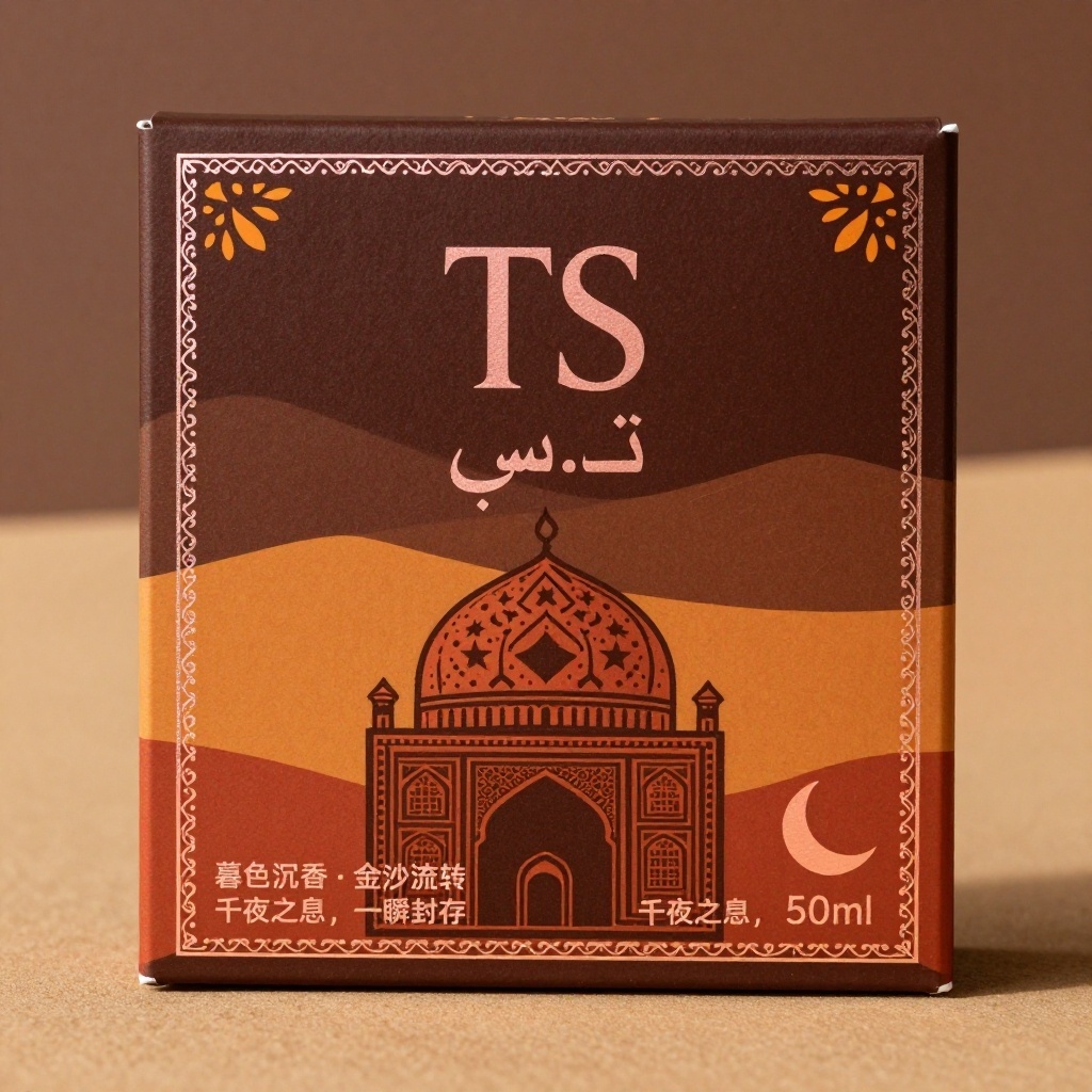产品:香水;品牌名:TS;包装样式:瓦楞纸箱(270x195x140mm),选用厚实哑光瓦楞纸,表面压印细腻阿拉伯藤蔓暗纹提升触觉层次;包装营销卖点:以“沙漠夜宴的嗅觉诗篇”为概念,将阿拉伯庭院香料文化转化为视觉叙事;包装主视觉面排版:满版排版,主标题“TS”居中采用阿拉伯书法变体无衬线字72pt,副标题“ت.س”阿拉伯文缩写14pt置于其下,二级宣传语“暮色沉香·金砂流转”+“千夜之息,一瞬封存”各10pt分列左右底角,净含量“50ml”嵌于右下玫瑰金新月图标内;设计元素图案:背景层为可可棕至琥珀色横向渐变模拟沙丘光影,主图案为抽象几何化清真寺穹顶轮廓,采复古装饰主义粗线描风格,穹顶内填陶土红星月镂空纹,四角放射状分布柑橘橙香料叶小图标,边缘饰玫瑰金伊斯兰藤蔓连续纹烫金线条;设计风格:现代极简结构承载阿拉伯装饰美学;主题配色:主色深邃可可棕+温暖琥珀色,辅色陶土红+柑橘橙。