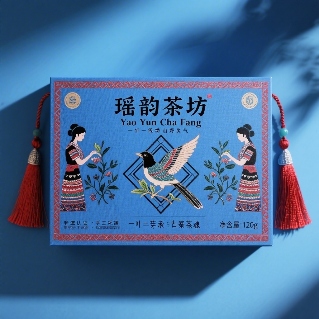 产品:隆回花瑶挑花文创茶叶;品牌名:瑶韵茶坊;包装样式:长方形精品礼盒,厚质艺术纸覆磨砂膜,触感如手工土布温润朴拙;包装营销卖点:以非遗挑花纹样为视觉核心,通过几何纹骨架、花鸟纹灵动、人物纹叙事三重元素演绎山野匠心;包装主视觉面排版:上下结构,主标题“瑶韵茶坊”雅黑粗体36pt稳居顶端,副标题“Yao Yun Cha Fang”衬线体9pt轻托其下,二级文案“一针一线绣山野灵气”与“一叶一芽承古寨茶魂”分列7pt小字于中段两侧,净含量“120g”标注右下角5pt无衬线体;背景层为靛蓝渐变晕染仿土布经纬肌理,主图案采工笔细腻风——中央锦鸟展翅衔茶枝,羽翼嵌几何菱格,两侧对称分布挑花少女采茶剪影,绛红流苏纹带沿边框垂落装饰,四角圆形小图标内含“非遗认证·手工采摘·原生茶园·低温窨制”字样;设计风格:民族现代主义融合工笔写实与抽象构成;主题配色:靛蓝为主,绛红为辅。