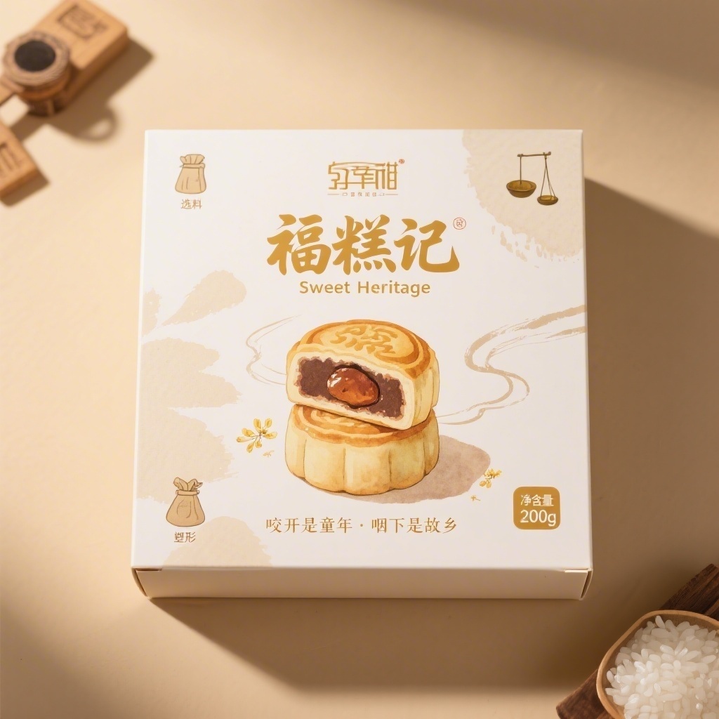 产品:点心;品牌名:福糕记;包装样式:飞机盒,选用轻质哑光白卡纸,表面微磨砂触感;包装营销卖点:以“字里藏甜·图中有味”为核心,强调图文叙事与视觉食欲双重唤醒;包装主视觉面排版:满版排版,主标题“福糕记”为手写书法体52pt居中压图,副标题“Sweet Heritage”无衬线体10pt紧贴其下,二级宣传语“咬开是童年”+“咽下是故乡”各7pt分置左上与右下角,净含量“200g”嵌入右下图标内6pt;设计元素图案:背景层为晕染水墨糯米纹理,中央主图案采用水彩天然风绘制三层点心剖面——枣泥流心、豆沙绵密、桂花晶冻,边缘点缀毛笔飞白线条模拟蒸汽轨迹,四角嵌入微型插画图标:老灶、木模、布袋、铜秤,分别标注“选料”“塑形”“包裹”“称重”;设计风格:现代插画融合东方留白美学;主题配色:主色暖米白,辅色琥珀金。